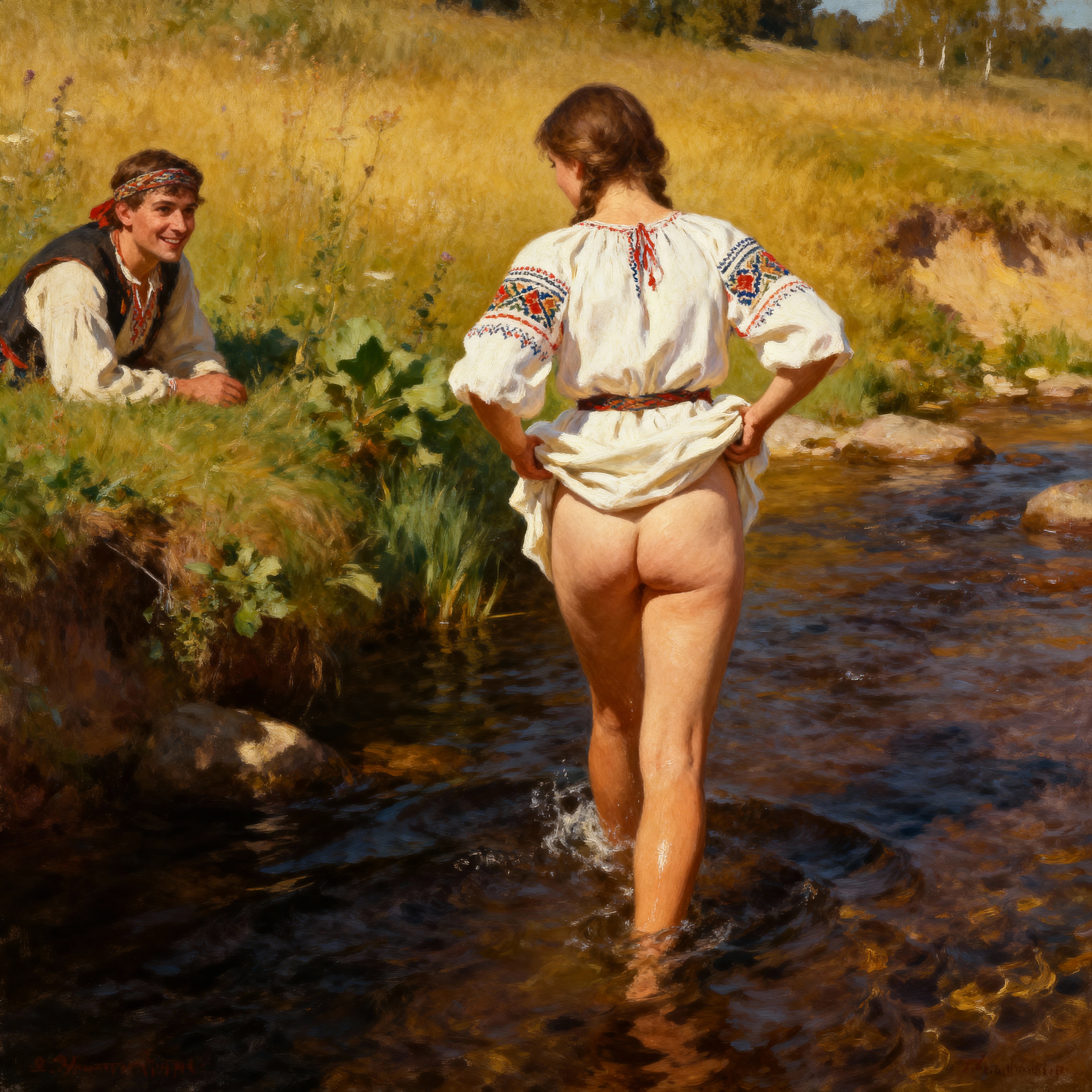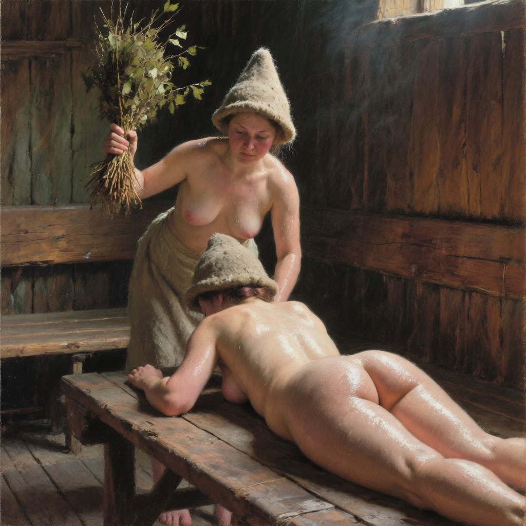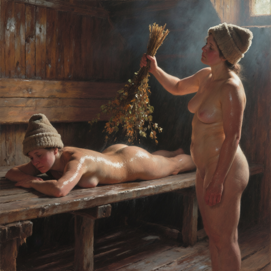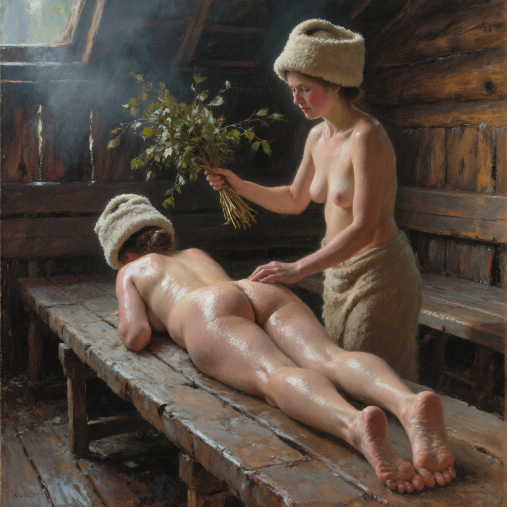 >>1371354 Masterpiece oil painting of two young Russian Women in a traditional wooden steam room (also known as banya). They have nothing on except traditional wool hats. One woman is lying face down on a wooden bench on her stomach, relaxed. The other woman stands next to her, holding a bundle of thin birch shoots with a lot of leaves(venik) in her raised hand, ready to gently spank lying woman’s bottom with this bundle. Their bodies are sweaty and glistening, their cheeks are slightly flushed from a heat as they have been in a steam room for a while. They are clearly exhausted from the heat. In the style of 19th-century Russian Realism and the Peredvizhniki. The scene is lit by soft, cool early morning light, with an earthy and muted color palette. Meticulous detail on the figure, tranquil and atmospheric.
