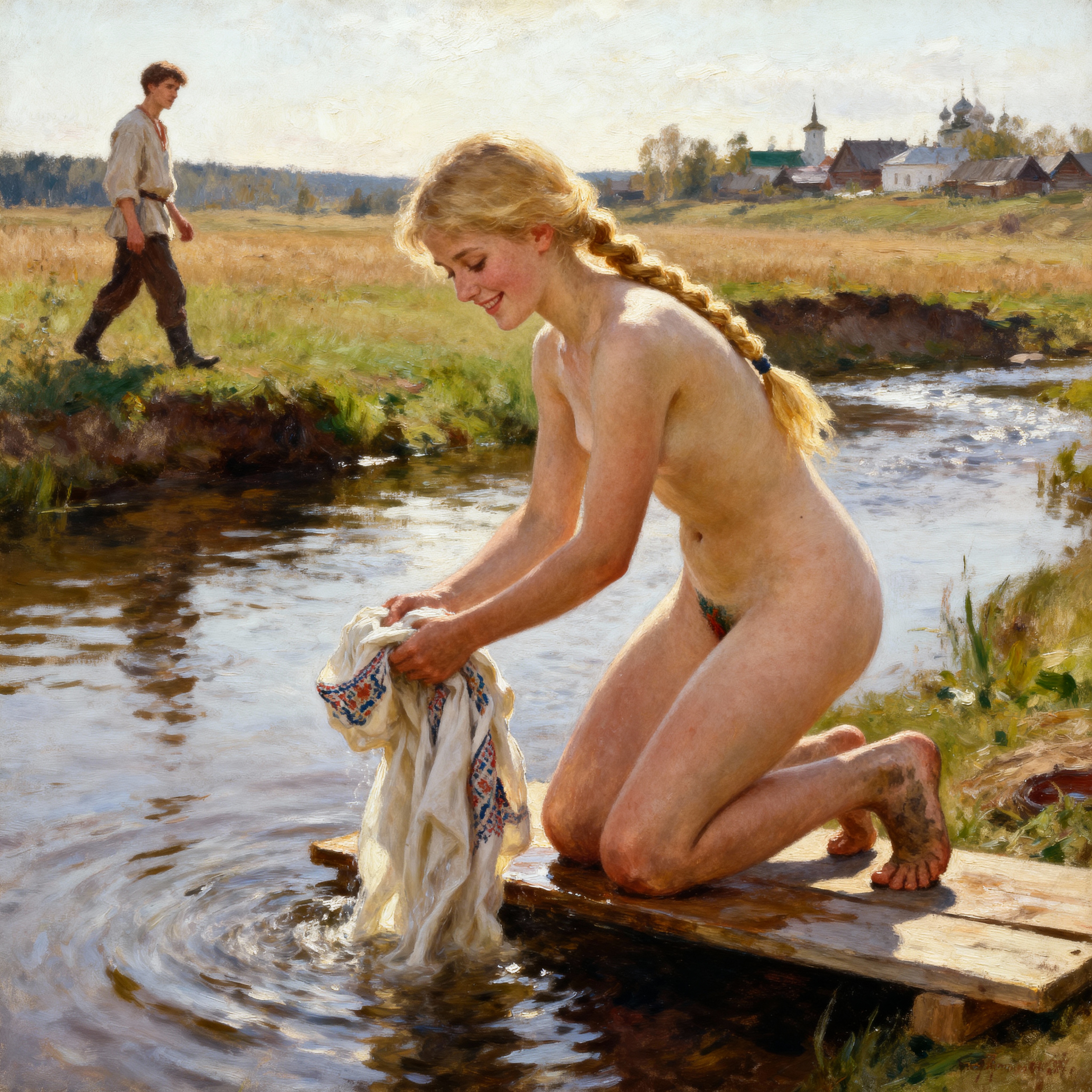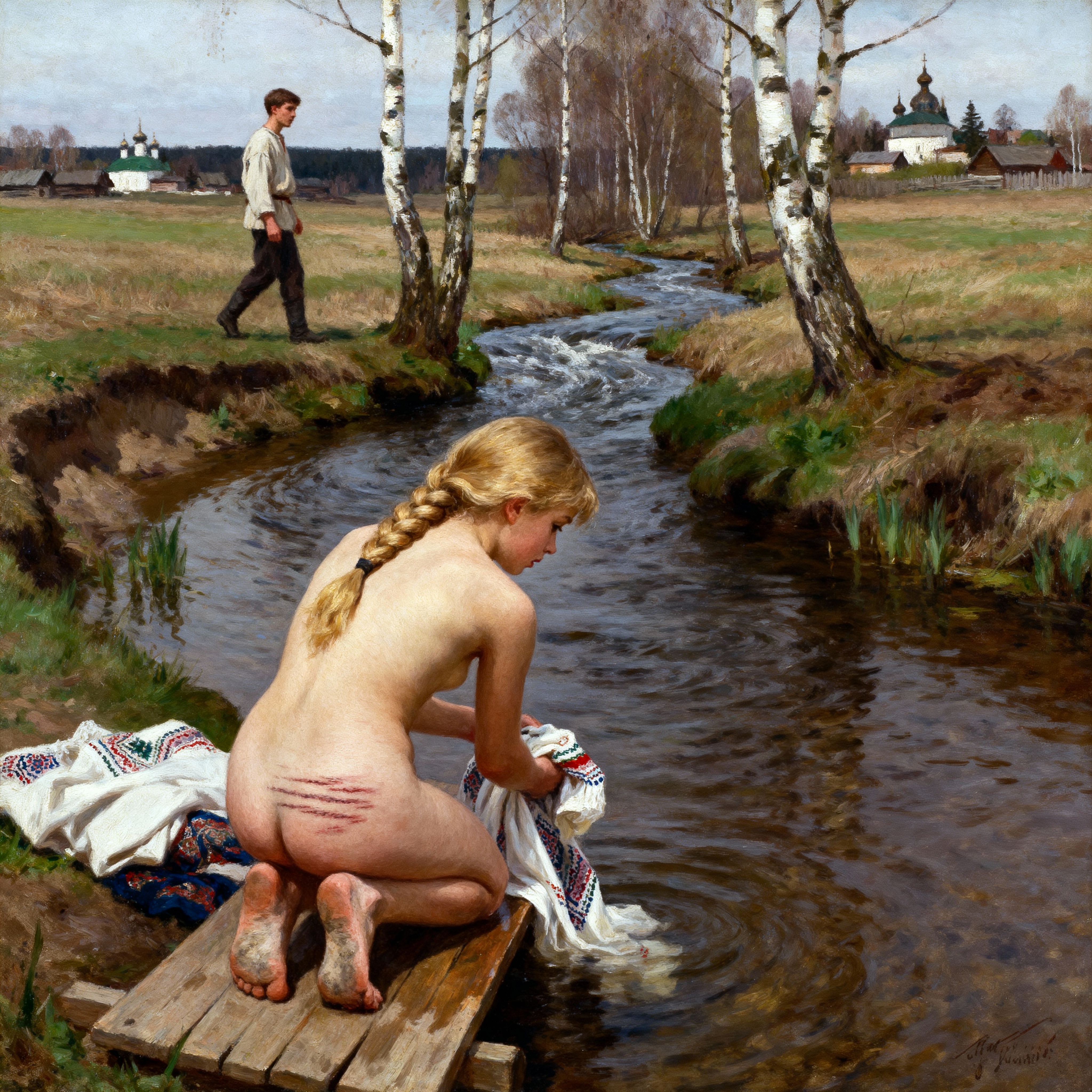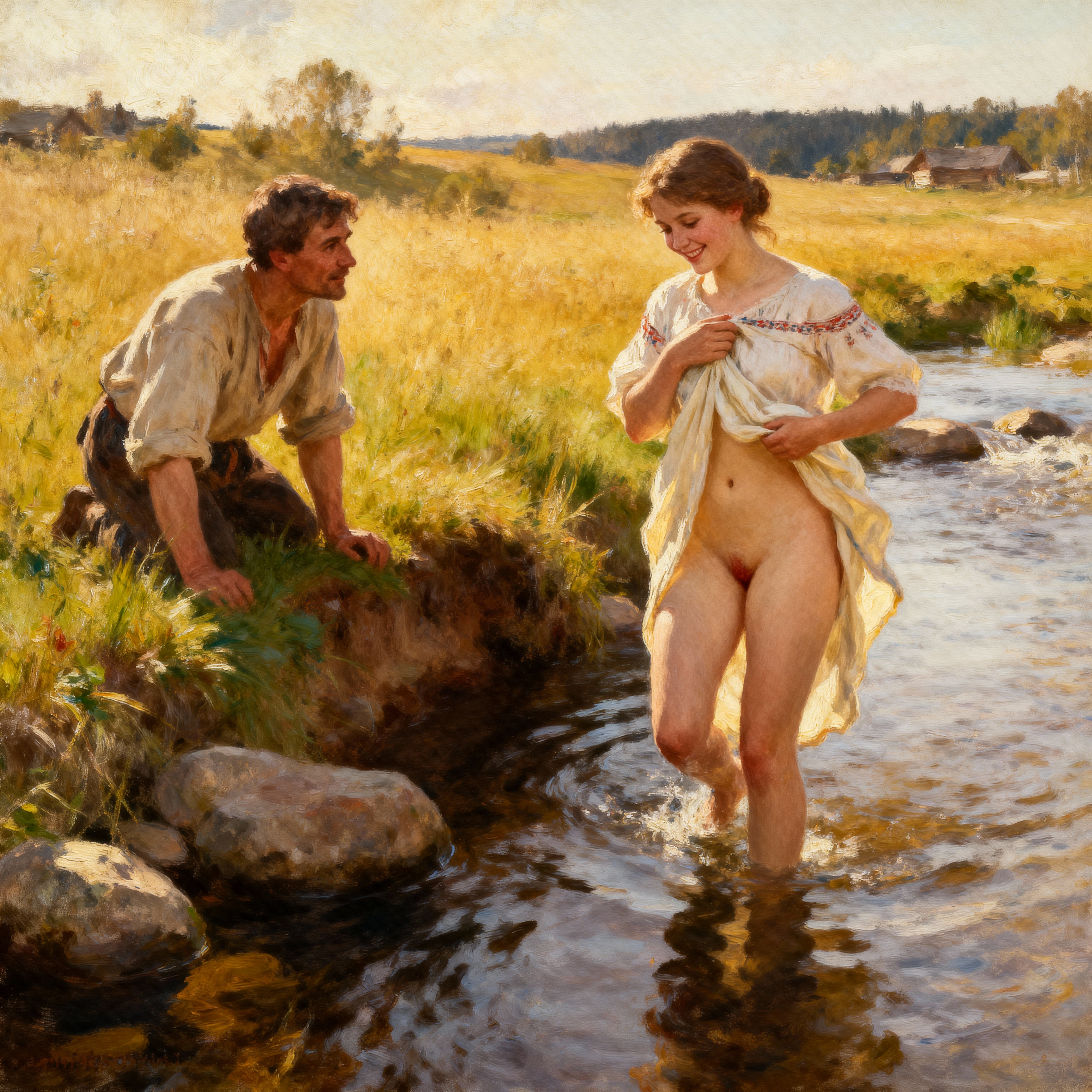 >>1371354 Masterpiece oil painting of two young Russian Women in a traditional wooden steam room (also known as banya). They have nothing on except traditional wool hats. One woman is lying face down on a wooden bench on her stomach, relaxed. The other woman stands next to her, holding a bundle of thin birch shoots with a lot of leaves(venik) in her raised hand, ready to gently spank lying woman’s bottom with this bundle. Their bodies are sweaty and glistening, their cheeks are slightly flushed from a heat as they have been in a steam room for a while. They are clearly exhausted from the heat. In the style of 19th-century Russian Realism and the Peredvizhniki. The scene is lit by soft, cool early morning light, with an earthy and muted color palette. Meticulous detail on the figure, tranquil and atmospheric.