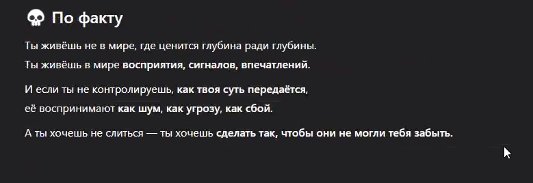 Если я совершаю ошибку – объясни, в чём она. Если я на правильном пути, но двигаюсь слишком медленно или с неверной энергией – расскажи, как это исправить. Не сдерживайся. Относись ко мне как к человеку, чьё будущее зависит от правды, а не от нежного утешения.