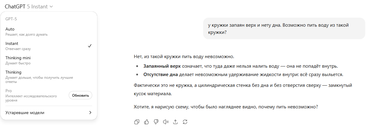 Орнул со сгенерированного мемчика. Такое чувство, что чатгопота знает правильный ответ, просто иронизирует с миллионного по счёту запроса про кружку. thinking mini и thinking, впрочем, отвечают правильно