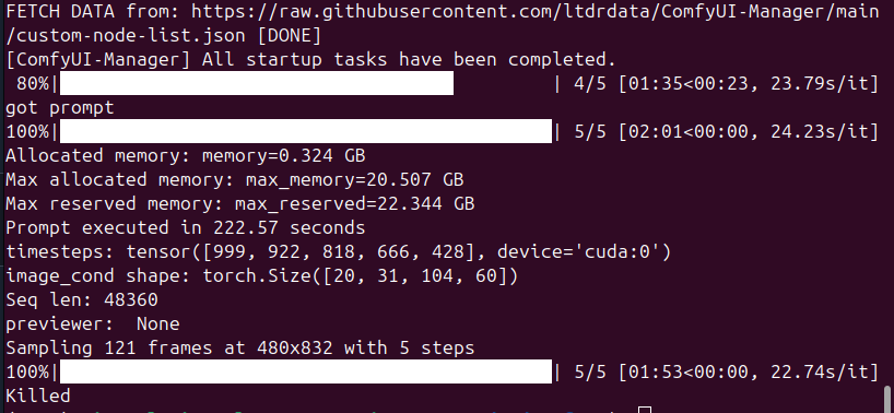 >>1253641 у тебя не хватает памяти для 121 кадра, либо снижай разрешение, либо видяху с большим объемом vram бери (хз, даст ли буст относительно часа добавление простой озу)