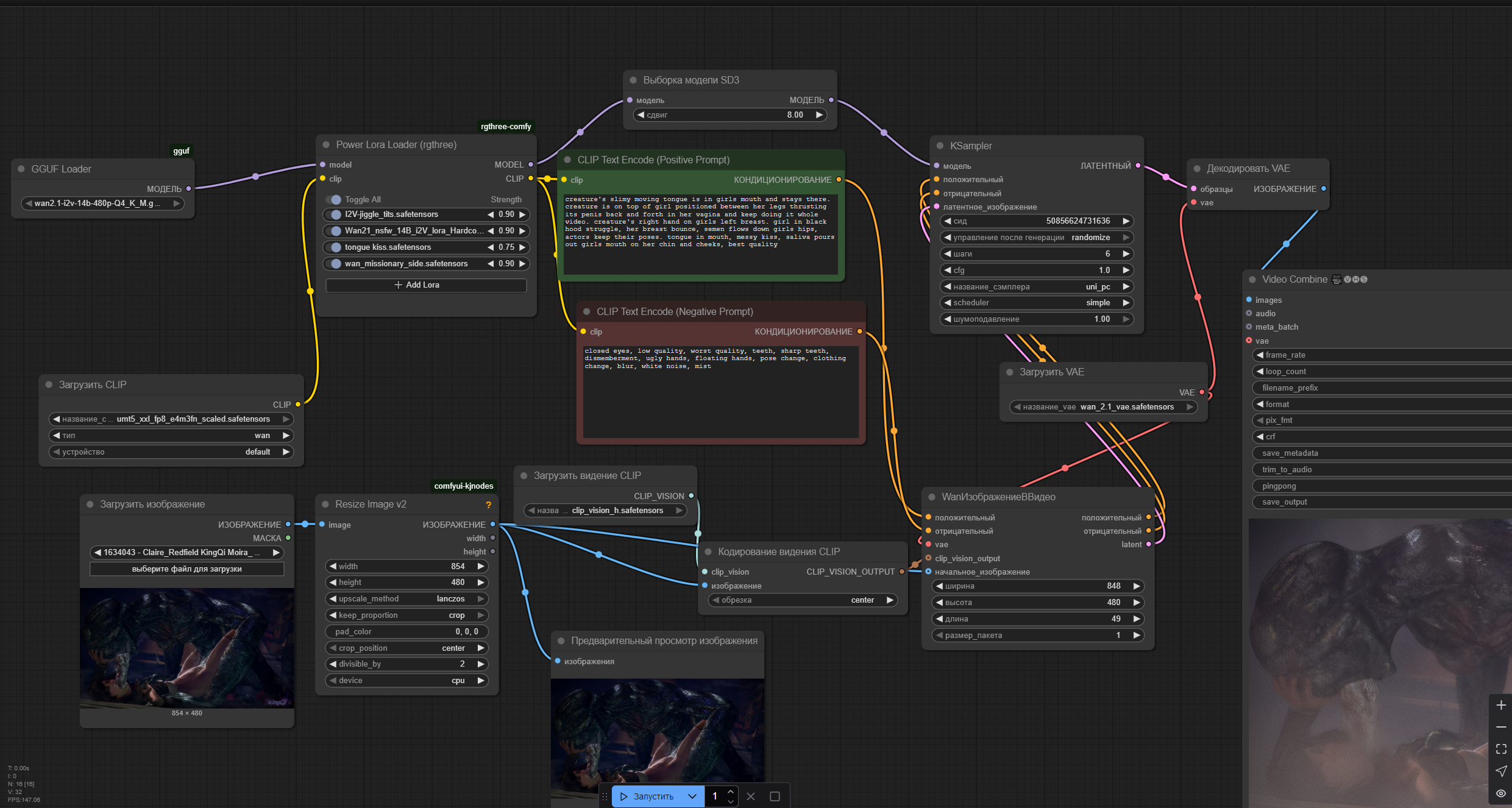 >>1268116 Наверняка дело в семплерах. Юзай киджая, вф приложил. Только замени лору, блоксвап и длительность. У меня не было никаких искажений и артефактов. Тяжелая пикча, но может быть сможешь анимировать с двигающимися точками в vace или с подходящей лорой, у меня не получилось с Wan Side View Missionary. Сами 3д рендеры - не проблема, оно может их анимировать так, что не сразу поймёшь, что это генерация.