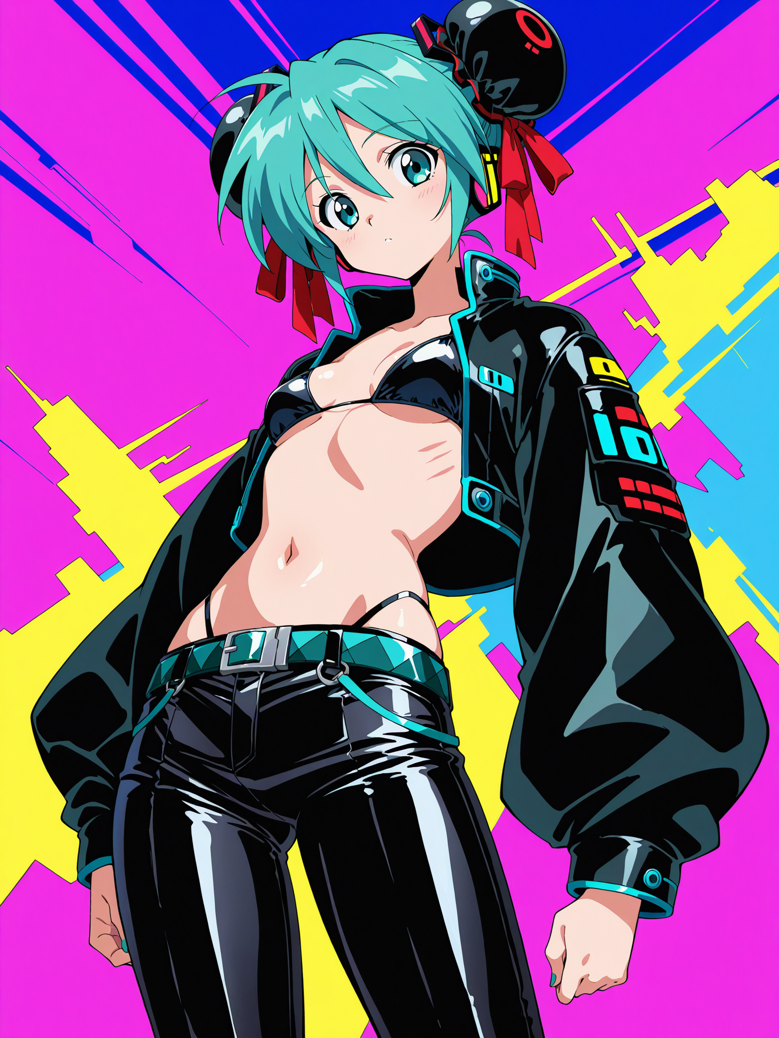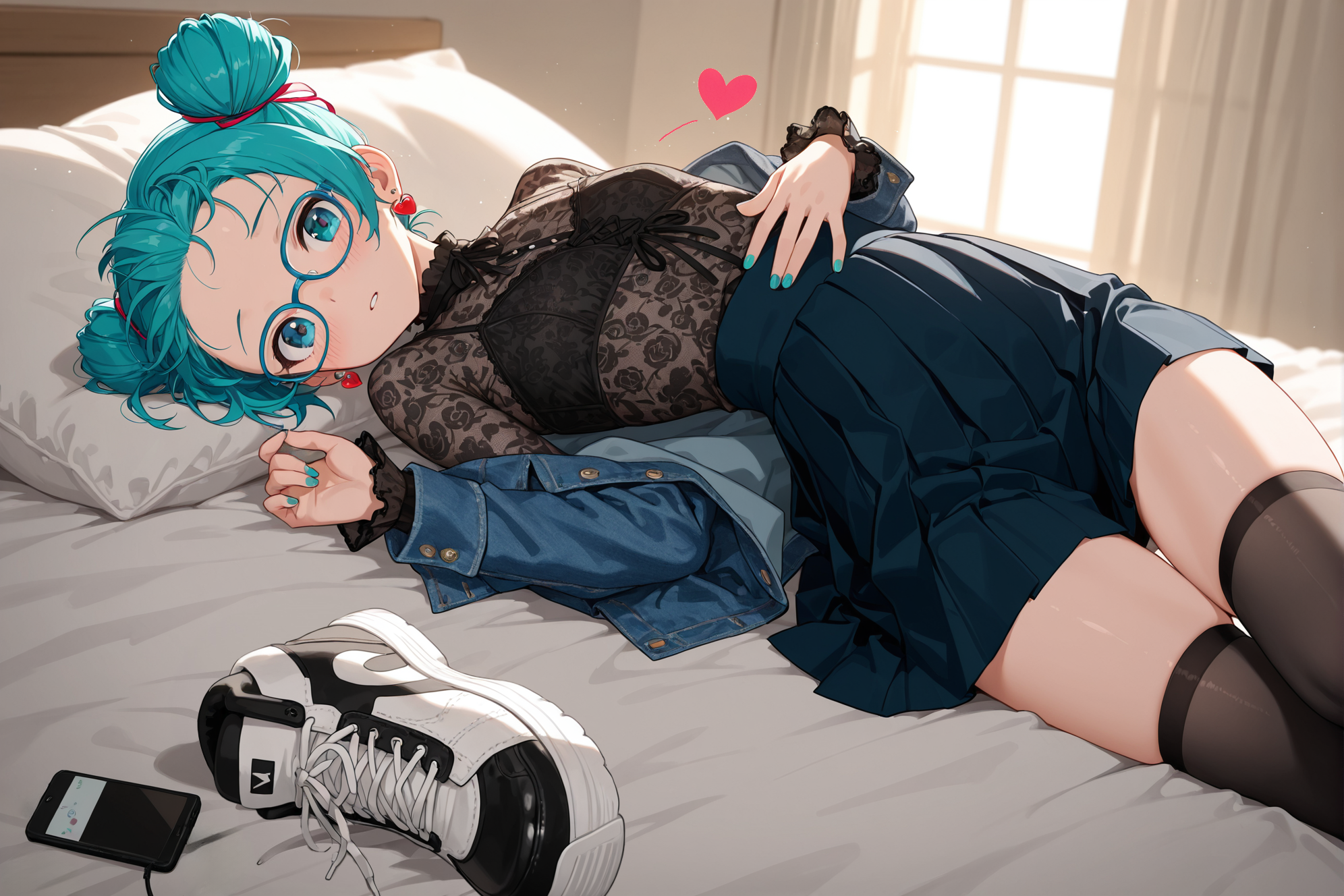 Позитив: >masterpiece, best quality, pastel colors, >1girl, solo, cowboy shot, >hatsune miku, cute face, short hair, double bun, bun cover, hair ribbon, big hair, oversized headgear, big headgear, heart earrings, big earrings, blue glasses, under-rim eyewear, >flat chest, >denim jacket, black miniskirt, high-waist skirt, pleated skirt, black shirt, lace shirt, see-through clothes, tight clothes, >white background, simple background,
