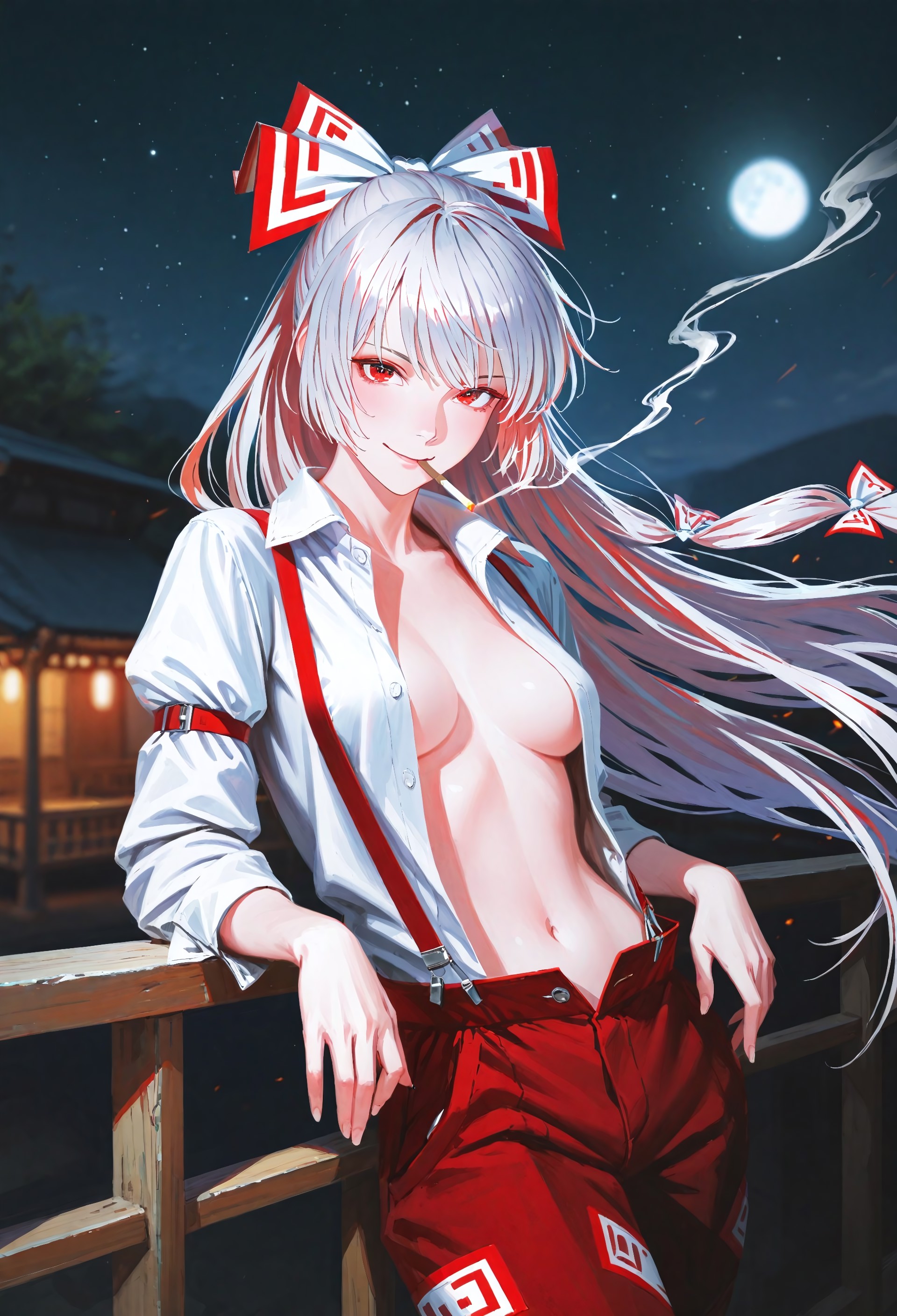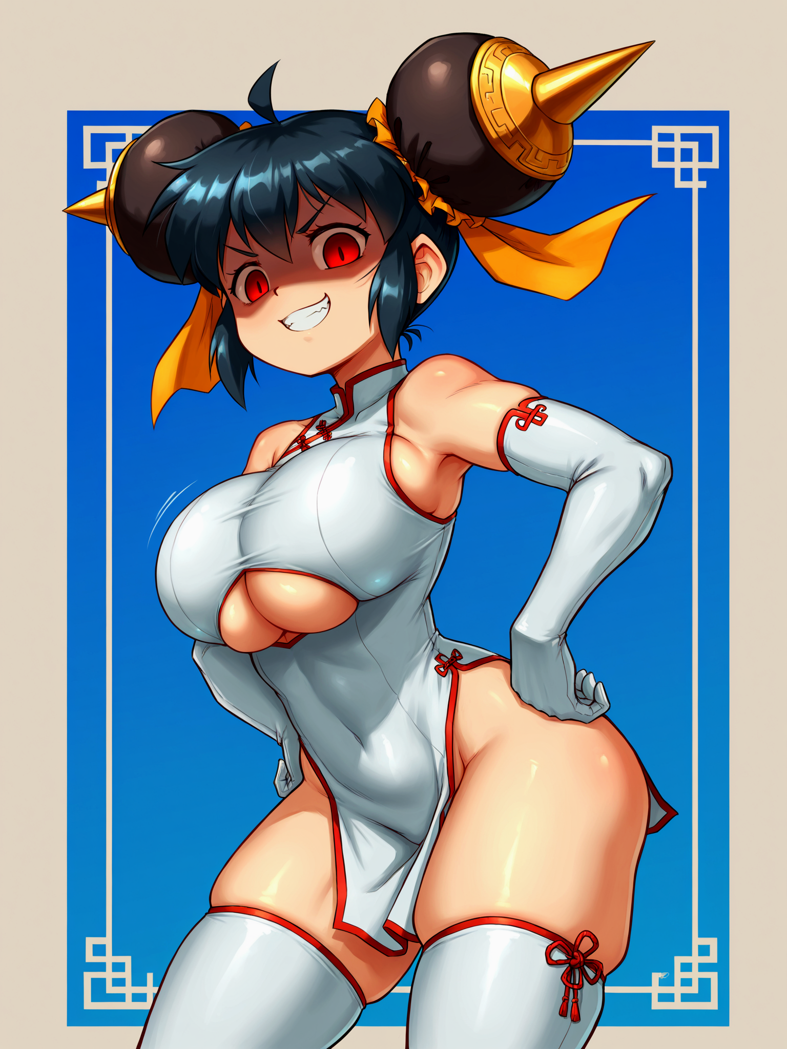 На второй был использован тэг `no bra` +`cleavage` в негативе а то постоянно несуществующая грудь оголялась, хе-хе. Еще заметил, что из-за bun cover ИИ имеет некоторую тенденцию добавлять китайские детали на одежду. Протечка токенов, походу - все-таки такая прическа почти всегда с китайскими мотивами соседствует. Добавление в негатив `china dress, chinese clothes` помогает.