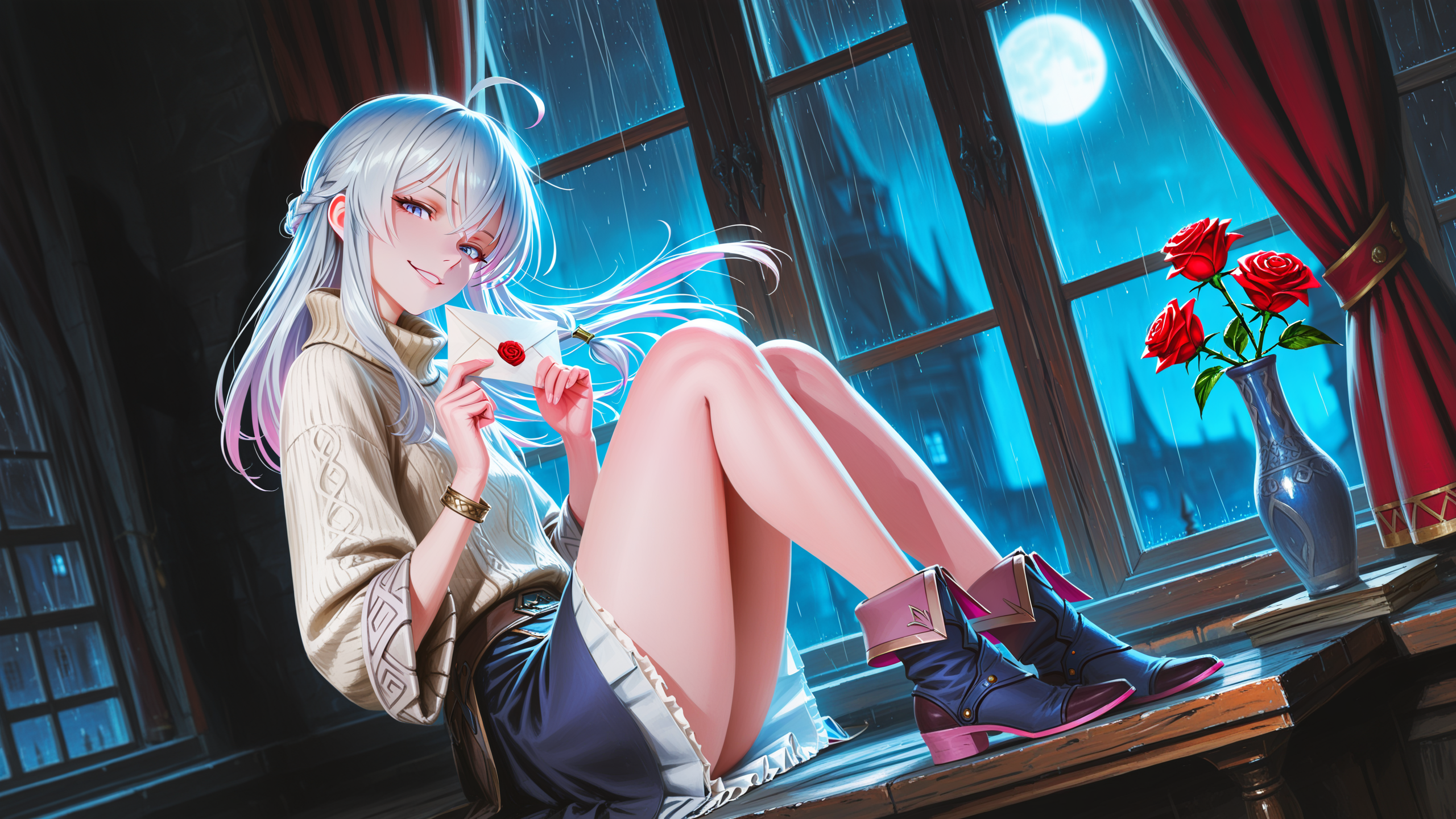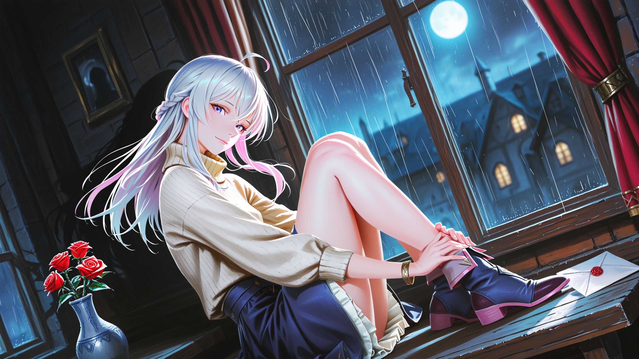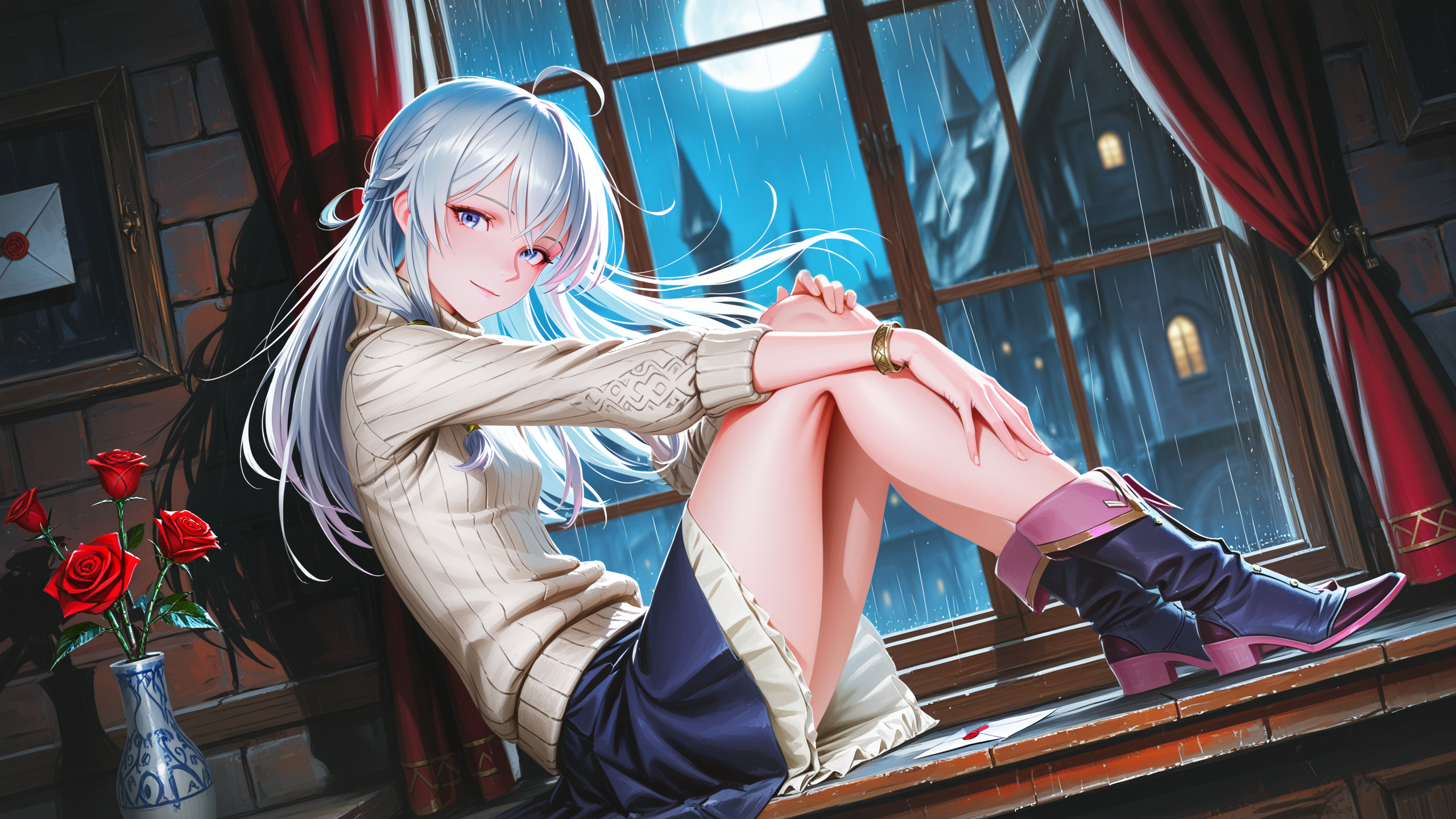 1girl, elaina, ivory hair, long hair, deep blue eyes, ahoge, adult, shadow, blurry background, expression, underlighting, small breasts, 21 yo age, mature female, action pose, light smile, looking at viewer, nababa style, hands, wind, realistic, posing, night, moon, stars, indoors, window, curtains, sitting on windowsill, medieval city, fantasy, dutch angle, full body, blue boots, rain behind window, turtleneck sweater, blue skirt, white underskirt, knees up, head tilt, from side,table, vase, rose, letter, braid, bracelet, hand on own knee, hand on own foot, cum in ass, after anal