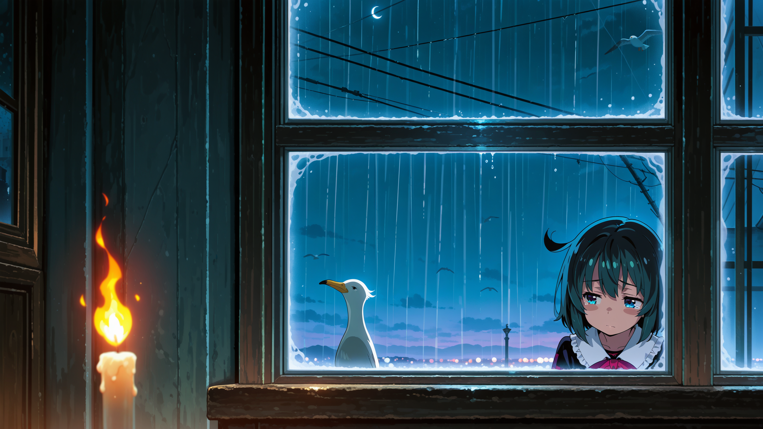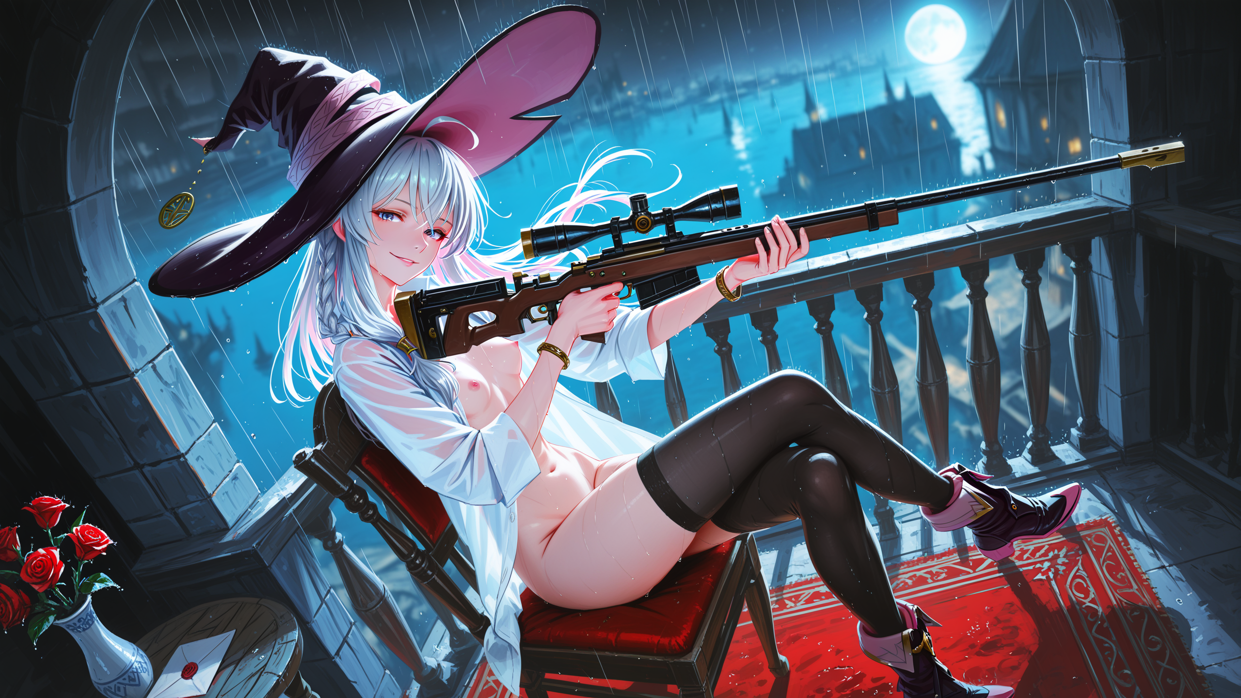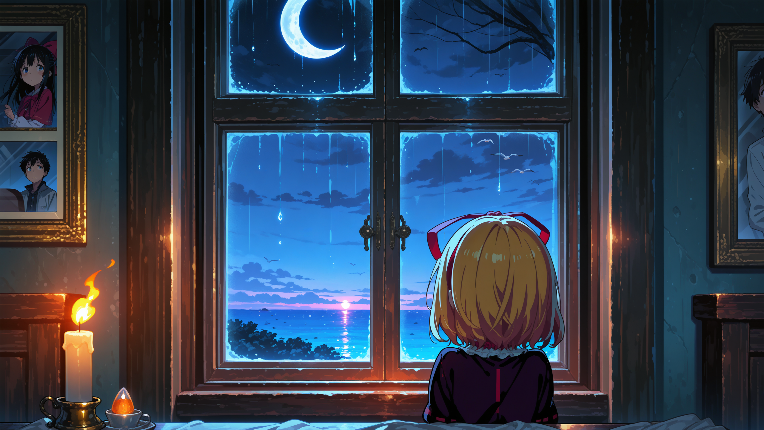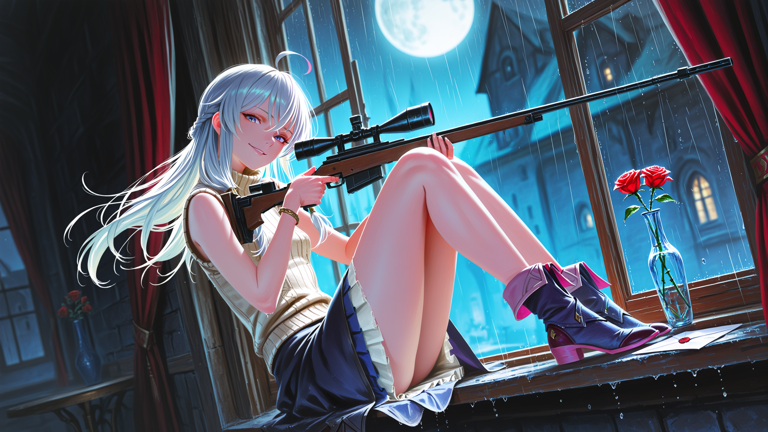 1girl, elaina, ivory hair, long hair, deep blue eyes, ahoge, adult, shadow, blurry background, expression, underlighting, small breasts, 21 yo age, mature female, action pose, light smile, looking at viewer, nababa style, hands, wind, realistic, posing, night, moon, stars, indoors, window, curtains, sitting on windowsill, medieval city, fantasy, dutch angle, full body, blue boots, rain behind window, turtleneck sweater, blue skirt, white underskirt, knees up, head tilt, from side,table, vase, rose, letter, braid, bracelet, hand on own knee, hand on own foot, cum in ass, after anal