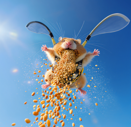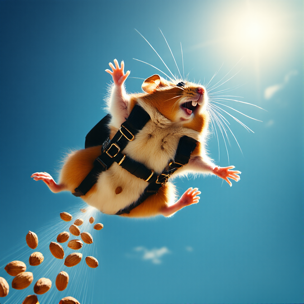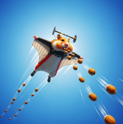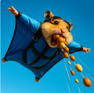 >>1296016 (OP) Промпт первый. Суть. Хомяк летит в вингсьюте в небе, мы смотрим на него снизу вверх. Облаков мало, небо ясное, картинка насыщенная рекламная, у хомяка расставлены в стороны лапы, плюётся орехами будто стреляет, струя/поток орехов изо рта, раздутые набитые орехами щёки.