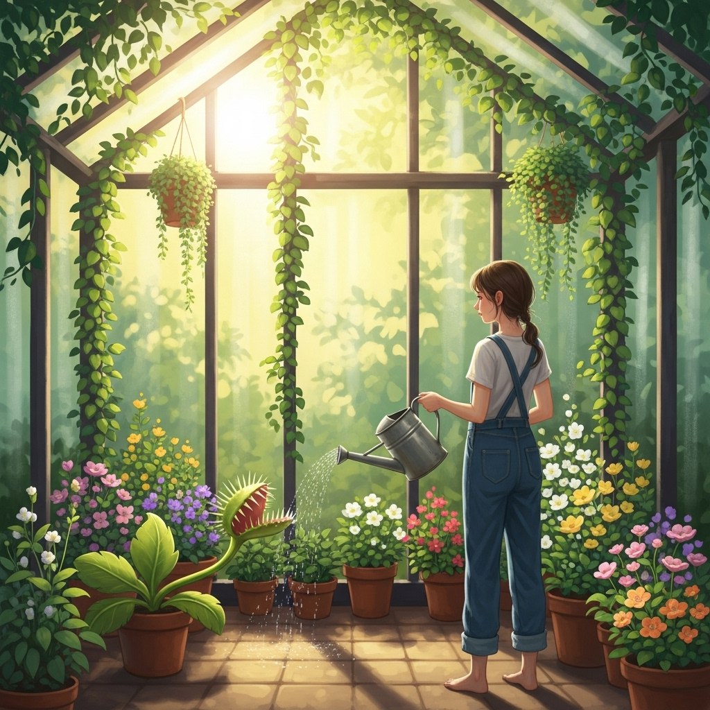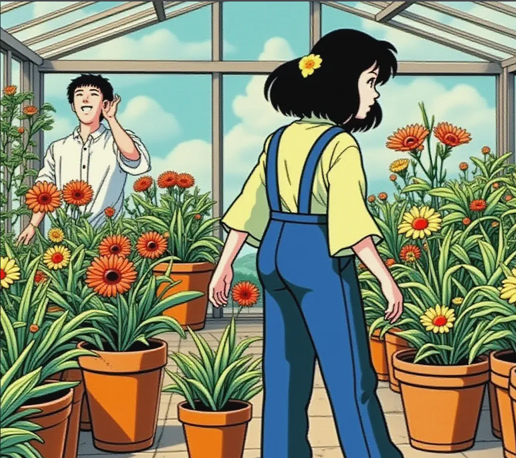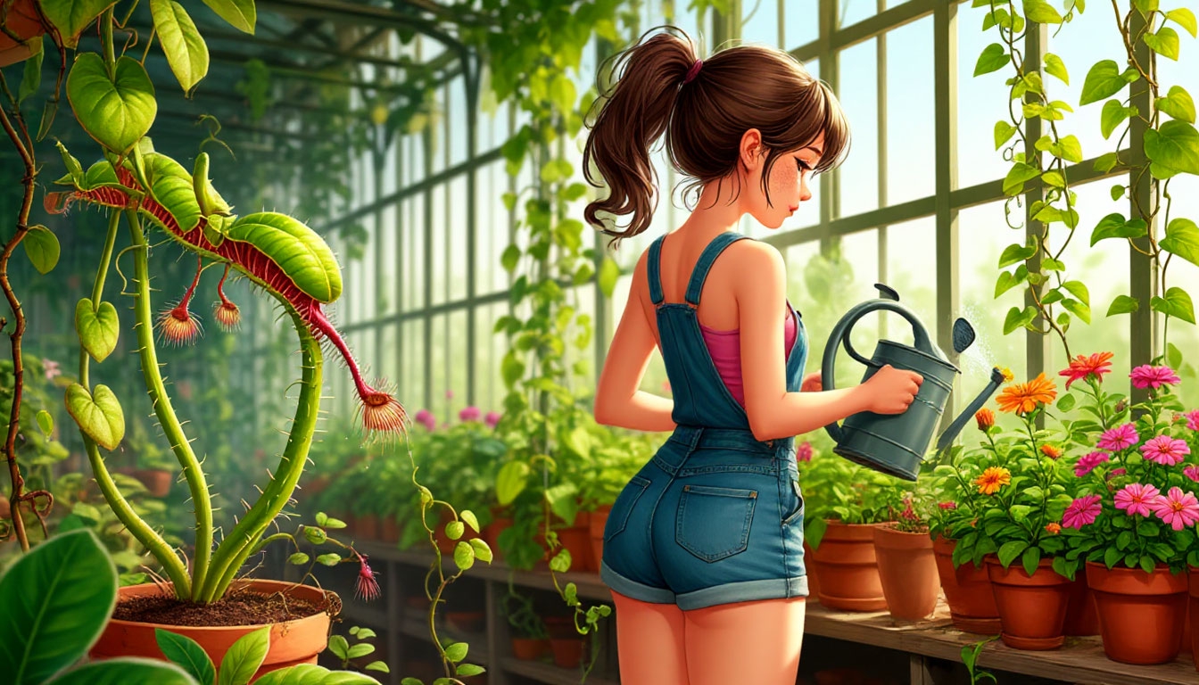 В оранжерее, солнечно, милая фигуристая девушка в комбинезоне, поливает вьющиеся и цветущие растения, в горшках. Мы видим её со спины. Лицо в профиль или отвёрнуто от зрителя.
