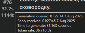 Чё-то они походу наебали с рекомендуемой температурой 1 эти попены (хотя на английском вроде норм). Ещё такой ризонинг смешной до этого написало, а он закрылся с пустым сообщением и удалился из-за скрипта баля. Там было про защищённые групы чё-то, что нельзя на них нападать. Обидно, так бы скинул И скорость нормальная, 7 т/с когда обычно 3.5, в 2 раза быстрее других моделей хмм