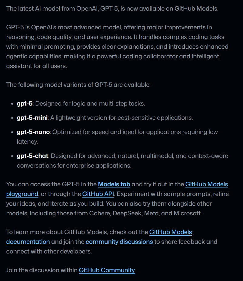 Доступны следующие варианты модели GPT-5: gpt-5 : Разработан для логических и многошаговых задач. gpt-5-mini : облегченная версия для приложений, чувствительных к стоимости. gpt-5-nano : оптимизирован для скорости и идеально подходит для приложений, требующих низкой задержки. gpt-5-chat : разработан для расширенных, естественных, многомодальных и контекстно-зависимых бесед для корпоративных приложений.