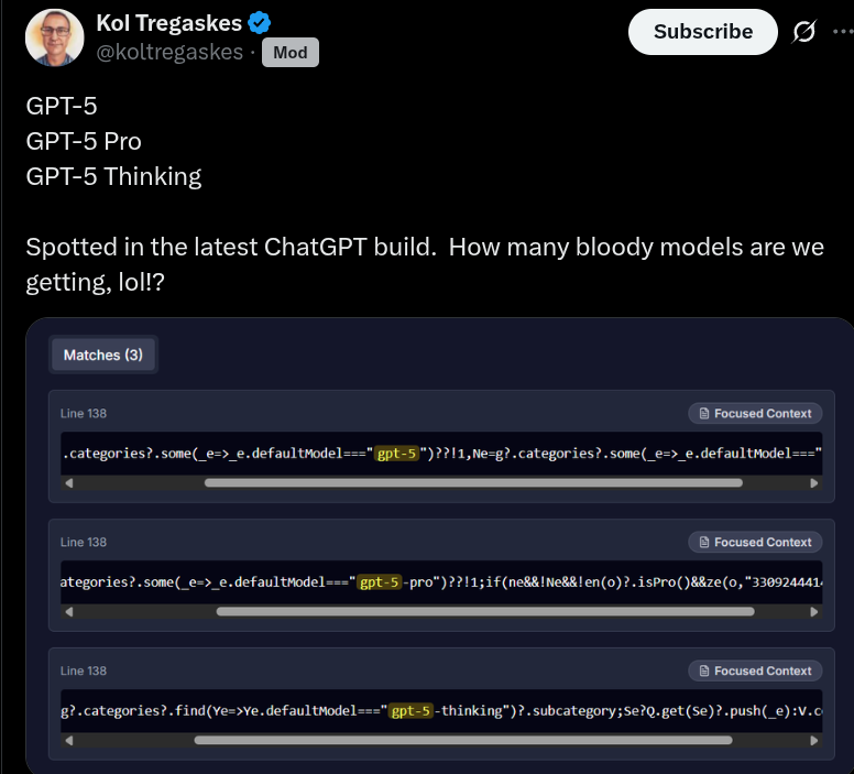 GPT-5 pro (пока только в ChatGPT, openai только через месяц примерно релизят -pro модельки в апи) GPT-5 thinking (возможно только в ChatGPT, типа как o4-mini-high, в апи будет параметр для thinking) GPT-5 GPT-5 Mini (возможно только в апи) GPT-5 Nano (возможно только в апи)