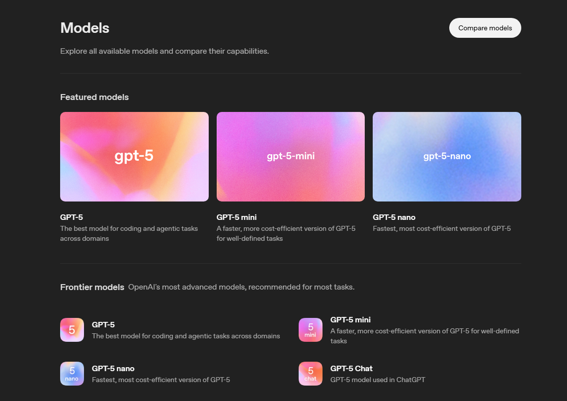 gpt-5 - полная версия, gpt-5-mini - лёгкая версия для экономии ресурсов, gpt-5-nano - для скорости и низкой задержки, gpt-5-chat - для сложных, естественных, мультимодальных и контекстно-зависимых разговоров. Для некоторых пользователей больше нет переключателя моделей, и он сам решает, когда ему нужно более тщательно подумать.