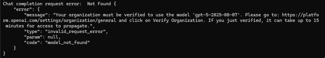 > Your organization must be verified to stream this model. Please go to: https://platform.openai.com/settings/organization/general and click on Verify Organization. If you just verified, it can take up to 15 minutes for access to propagate.