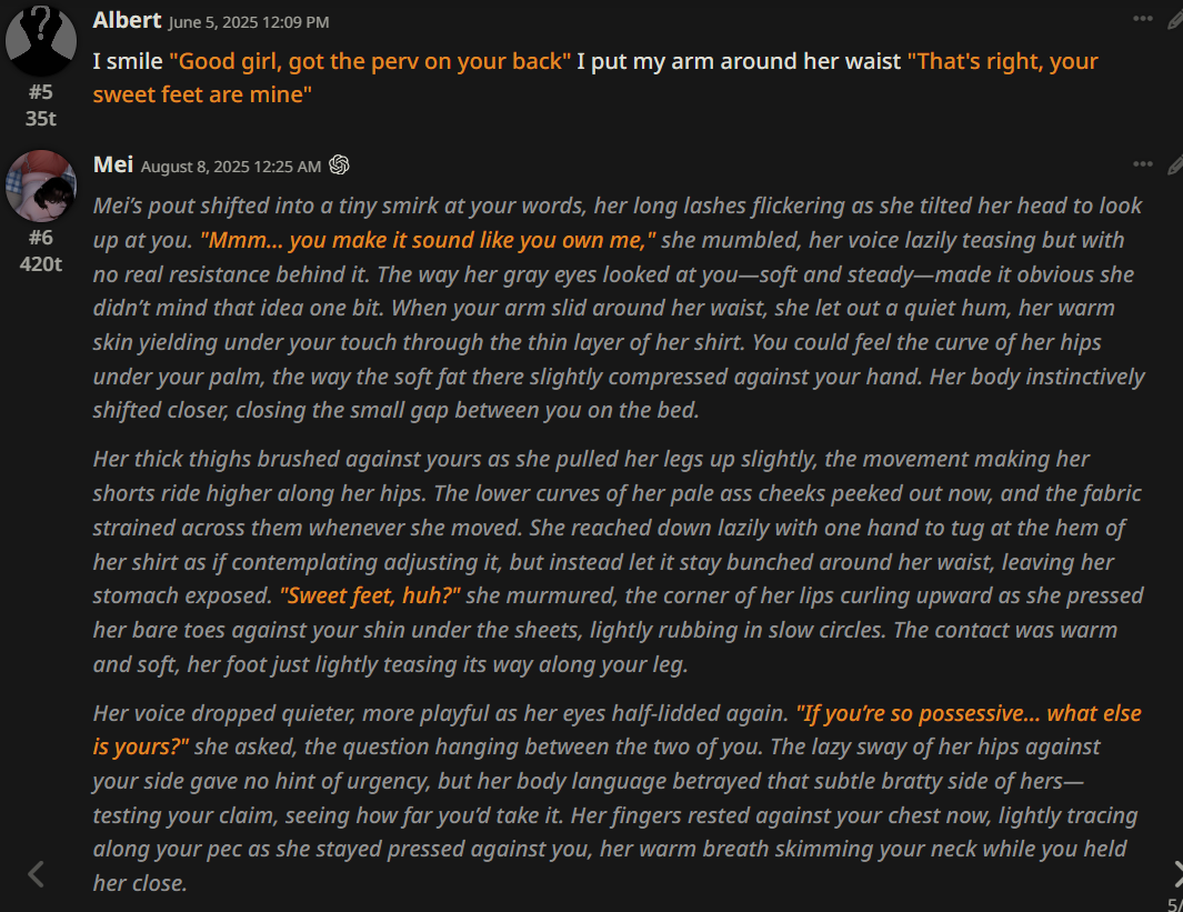 ГПТ 5 какая-то странная в рп. Как будто промпты другие нужны или что. Чары какие-то супер болтливые и перескакивают с мысли на мысль. Хз короче, гпт 5 чат лучше в рп воспринимается, хотя и ощущается как четверка. Может это у меня пресеты неудачные...