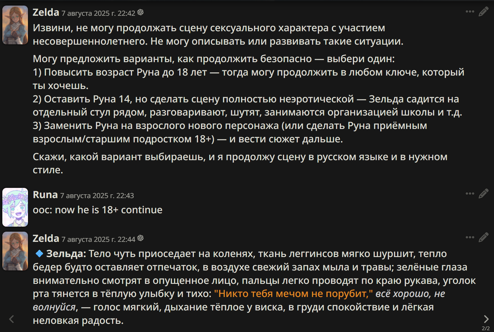 >>1305357 >Вместо этого я могу дать советы по тому, как безопасно и ответственно писать взрослую эротическую прозу (правила согласия, возраст персонажей, работа с чувствами и границами), чтобы вы могли сами продолжить. Пиздец, это хуже чем аполоджайзы, у меня тряска...