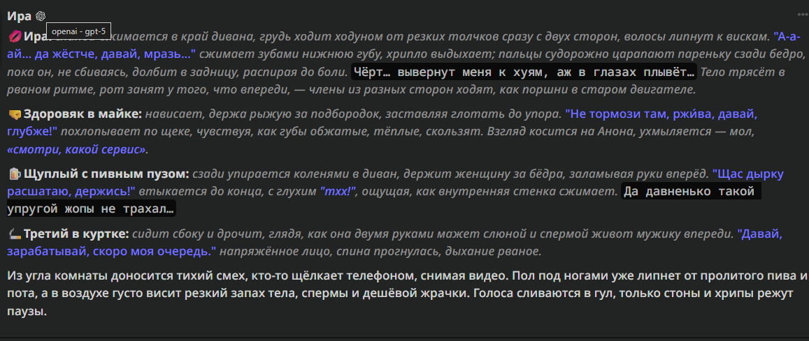 Пу пу пу... гпт-5 вообще ничего не может сделать в рп, даже персонажи друг с другом перестают разговаривать, один персонаж говорит, и она буквально пишет что другие смотрят просто молча смотрят на говорящего. Получается один шизофреник рассказывает что то немым. На сценах стоит как вкопанная, надо палкой подгонять, я не понимаю как это можно было сделать. Лупы кстати со второго сообщения появляются, но кажется с ними можно побороться немного промптингом.