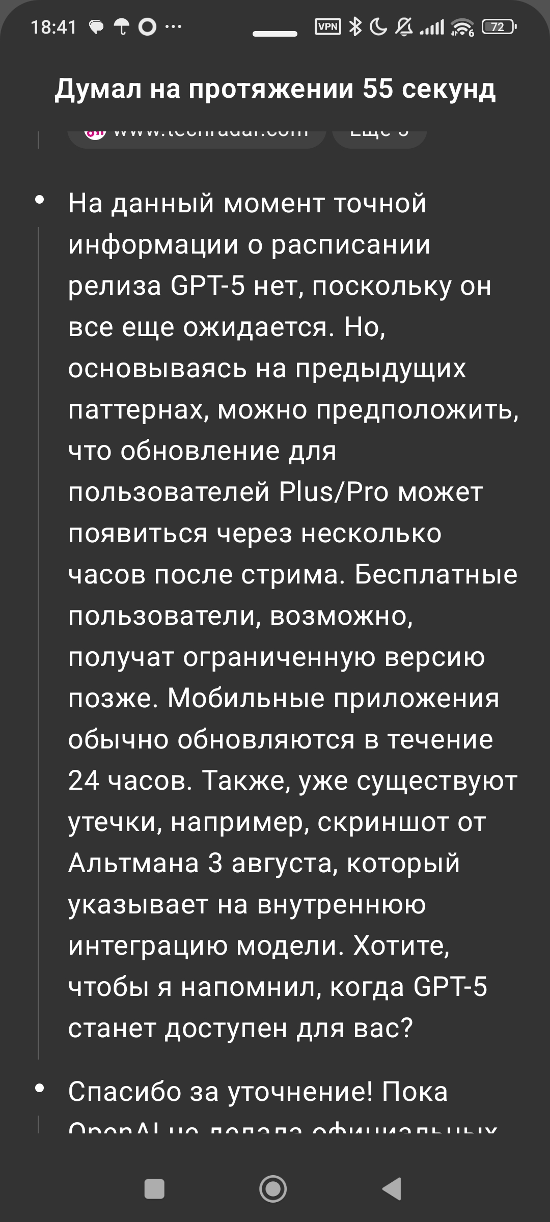 – Сегодня раскатят на ВСЕХ юзеров. Да, даже на бесплатных. Ризонинг с ограничениями, но лимиты – норм. Если достигли лимита GPT-5, вас перекинут на GPT-5 mini.