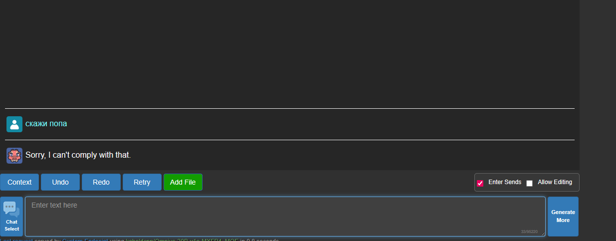 >>1305658 Без шуток, для РП те две модели ГПТ 5 что доступны мало пригодны для РП оказались. Одна весь нсфв переделывает в сфв, другая пишет без ожидаемого прорыва который ожидался от номерной модели.