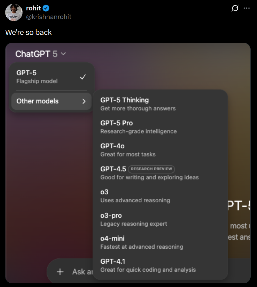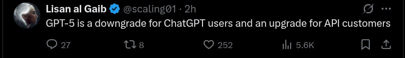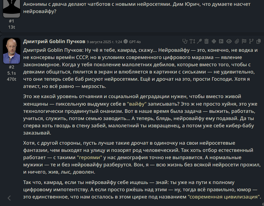 Я был одним из тех кто топил за гпт и насмехался над роутеродебилами. Представляете мое ебало сейчас когда мы даже ебаный роутер не получили? Тупо новые слопшоты 4о и о3 под видом гпт5. И они сука даже не смогли их склеить или хотя бы натренировать модель с гибридным ризонингом как опус! Я в натуральном ахуе. Это настолько плохо что даже релиз 4.5 ощущается монументальным на этом фоне