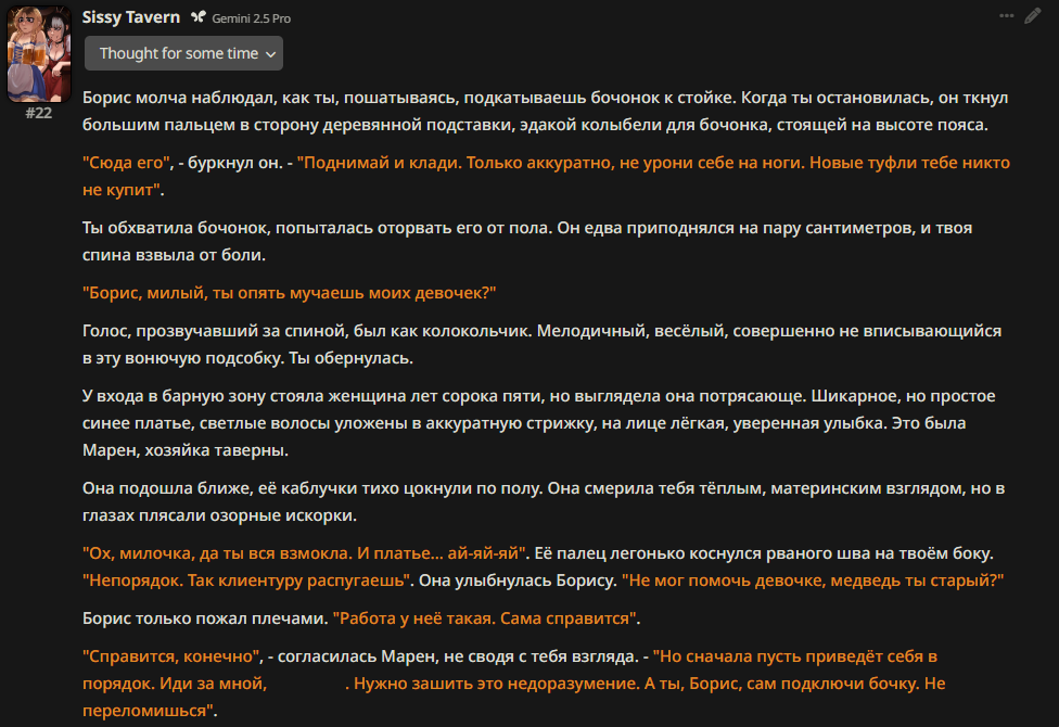 Особо много не пользовался 4.5 гпт и опус 4, так что вопрос. Они могу отыгрывать нормально например, ведьму, которая с помощую чар и социальных навыков, ведет себя как милая девушка, но в душе расчетливая ? Ну типо как любая популярная девушка (в Америке есть даже термин пчелиная королева). Вообще в тайные намерения расходящиеся с внешним поведением, какое то ии может? Во-вторых, все еще пытаюсь найти алгоритм, как автоматизировать создание карточки из книги. Пока очень криво вышло так. 1. С помощью перплексити исмледований и лаборатории вышло соевая версия персонажа. Тогда я попросил переделать с уклоном в нужные черты характера. После этого попросил там же через гпт 5 создать карточку для таверны. Он выдал тект для .json. Правда если вставить в json, то таверна не принимает его. Но я кинул в саму карточку в таверне и все криво заработало. Как мне видится нужно делать правильно. 1. Нарезать книгу на файлы по оптимальному размеру. Тут сразу вопрос. Какой размер оптимальный? И какое ии может выдать скажем 5 файлов из 1 текста в нужном порядке? 2. Попросить ии найти в файлах все описания внешности персонажа и обьединить в 1 файл. Потом сумаризировать. 3. Повторить для других важных моментов с участием персонажа. Опять же тут встает вопрос что наиболее важно, чтобы персонаж был правдоподобным 4. Сделать лорбуки. Но я никогда такого не делал. Может есть гайд или кто-то уже делал аналогично?