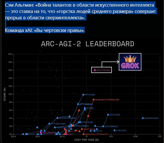 >>1312766 Да нифига, Грок при разработке с нуля дает ответы уже на уровне ГПТ5. Причем еще в 3й версии давал. Маск сманивает спецов у Цукерберга. Еще годик такого и Маск всех выебет. Все таки чел ракеты в космос запускает и теслы на рынок вывел, как ИИ сделать он тоже знает, это не цук бестолковый.
