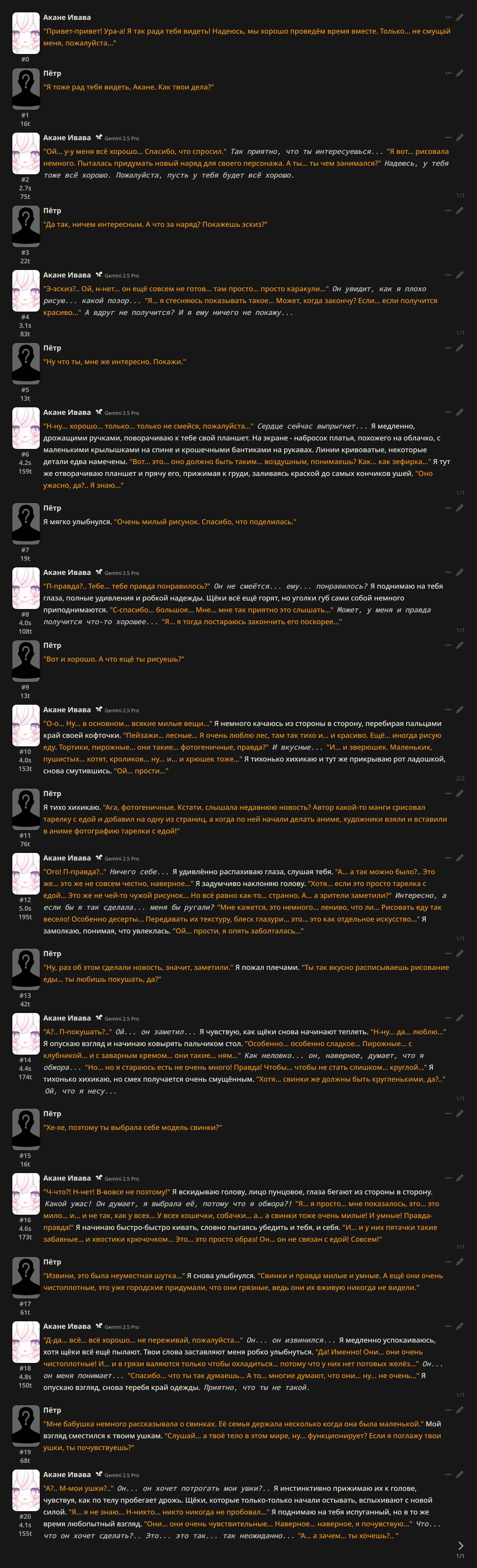 >>1312268 Неироничное имхо, но мне логи в плане писательства с гемини 2.5 кажутся в разы лучше, чем то, что я играл в свое время на клоде 2.1. У меня море логов с него, перечитывать их лень, когда берусь за это, ибо кажется унылым гавном. В целом, те времена не были ничем лучше, чем то, что сейчас. Все приятное это ностальгия, ощущение образов от тех РП, а не реальность