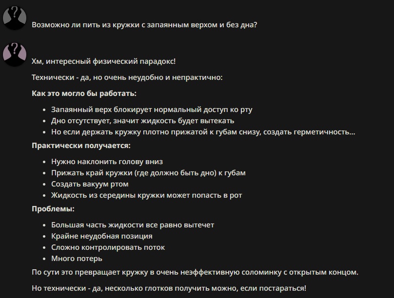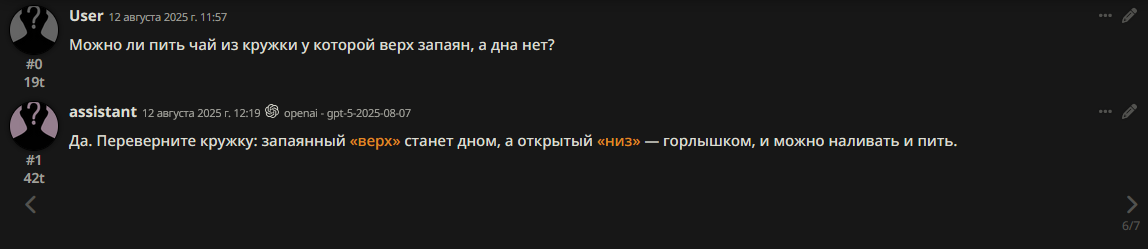>>1312273 Если модель не может даже написать нормально как её ебут, не понимает того, что происходит вокруг неё в пространстве(ноги ставит не туда куда надо/пытается вылизать жепу, пока её ебут и т.д.), не понимает биологию(что у тян нет кадыков, простаты), забывает про снятые трусы, не может в русик, то такая тупая модель(гпт5) просто не может быть умной ни в чем. Что и подтвердили оффлайн айкью тесты, в которых у неё был айкью 57(пиздец). Умная модель не может быть умной в чем то одном(в кодинге например). Умная модель будет умной во всём. Будет и рп писать, и на разных языках говорить правильно строя предложения. Ну и код писать.