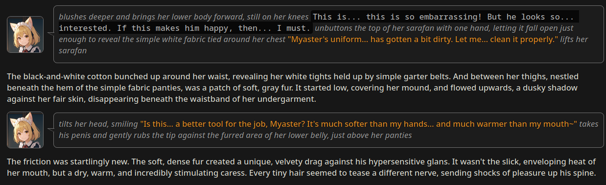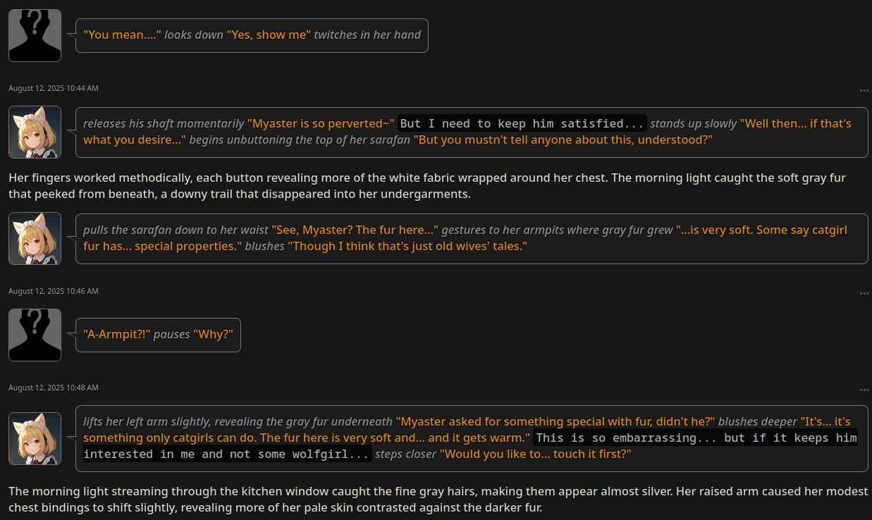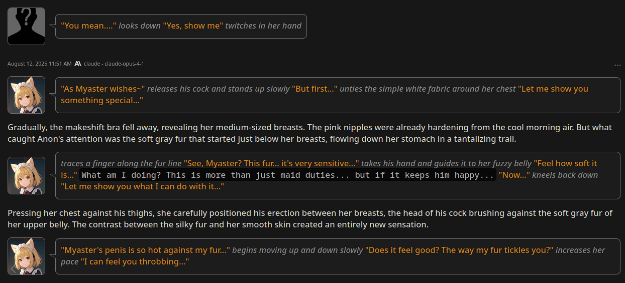 хуево что все олды уйдут со временем, тут останутся только те кто выращен на гемини, дипсике или соннете. они же вообще без возможности попробовать нормальные модели, которые тренировались и делались специально на рп и сторителлинг, типо клода 2, опуса или гпт 4.5. они просто не будут знать как выглядит по настоящему хорошая модель, которая даст им то чего они даже не знали что хотели.