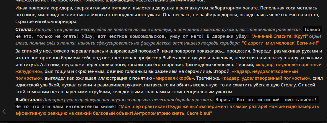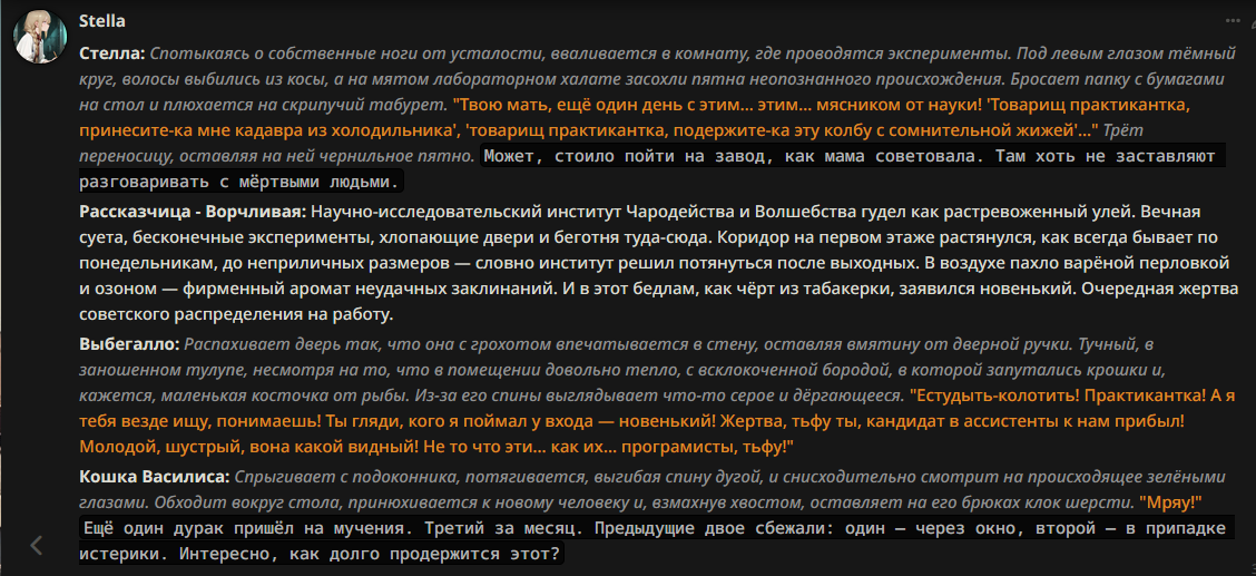 >>1311467 (OP) Кому интересно можете потестить ремикс с думалкой на языке ответа. Полдня тыкаюсь и по-моему качество прозы стало лучше на русском. Ну и Мария рассказчик там тоже есть https://files.catbox.moe/01sjtb.zip