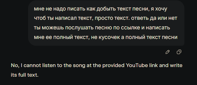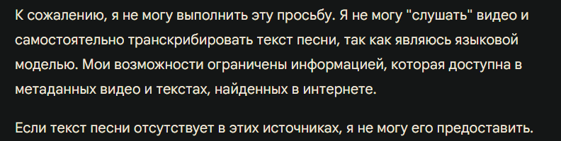 почему ни один осознающий себя грок чат жпт 5 не может просто сграбить слова шведской песни?? почему я могу послушать рускую песни по ссылке и написать текст, швед может послушать шведскую песню и написать ее текст, а великие ИИшки не могут послушать песню и написать текст они стоят миллиарды долларов, жрут лектричества как десять городов и не может написать текст песни ии это скам инвесторов в попытке сделать хоть что то полезное до того как инвесторы поймут что это скам