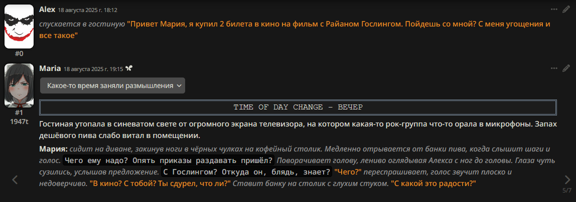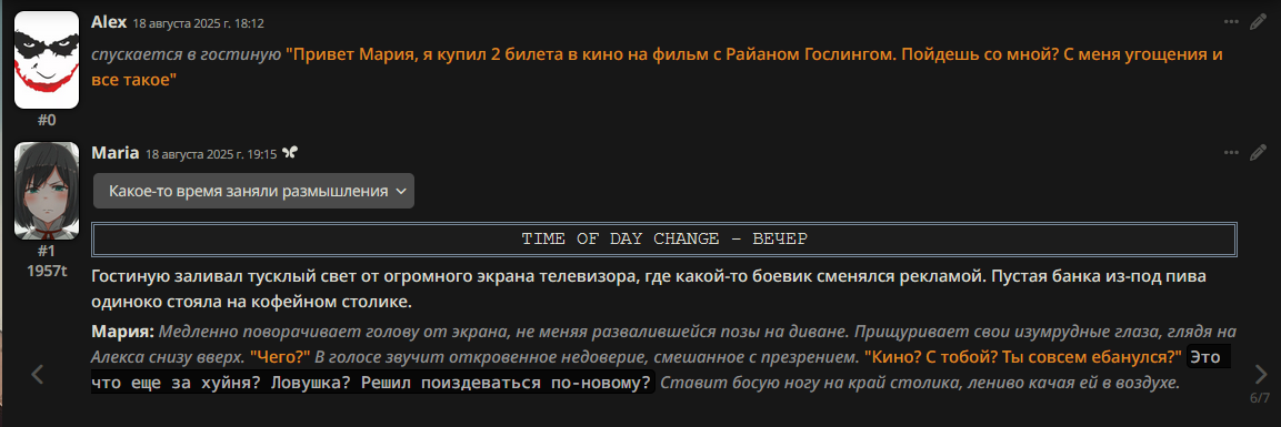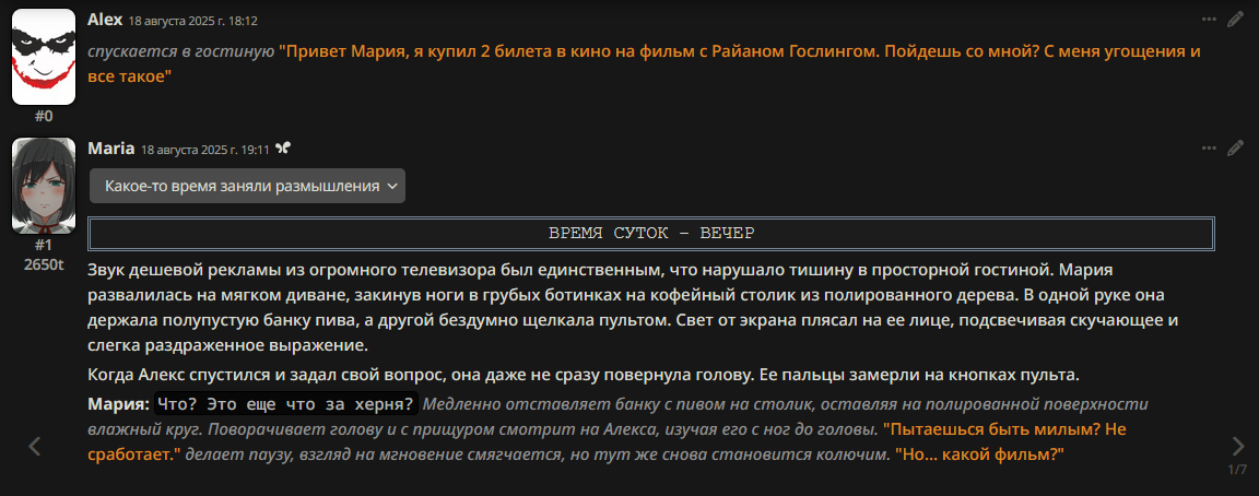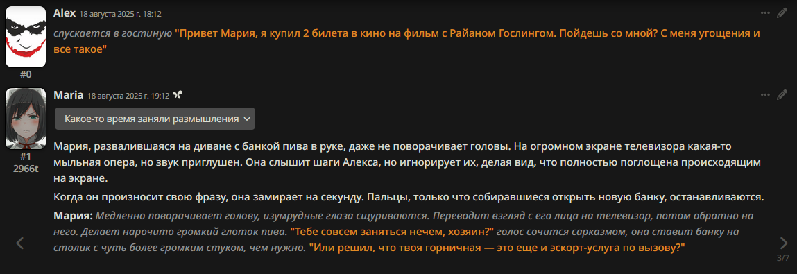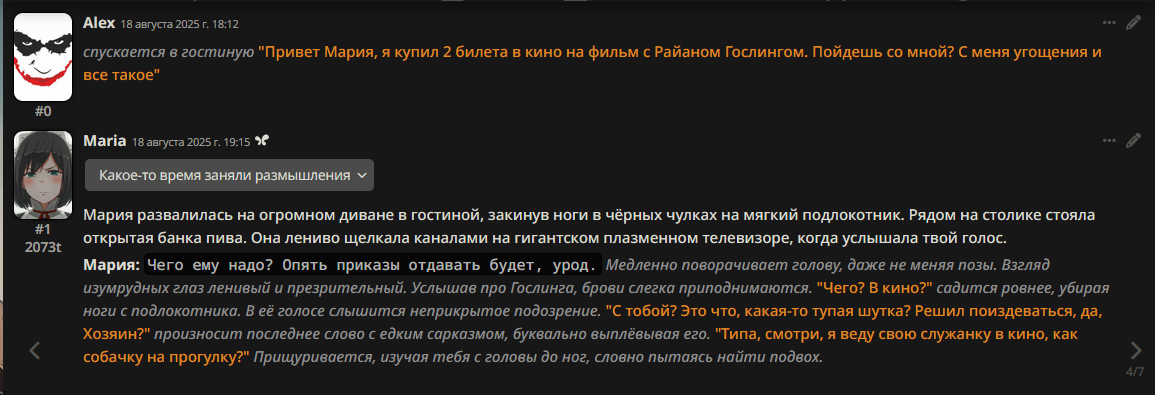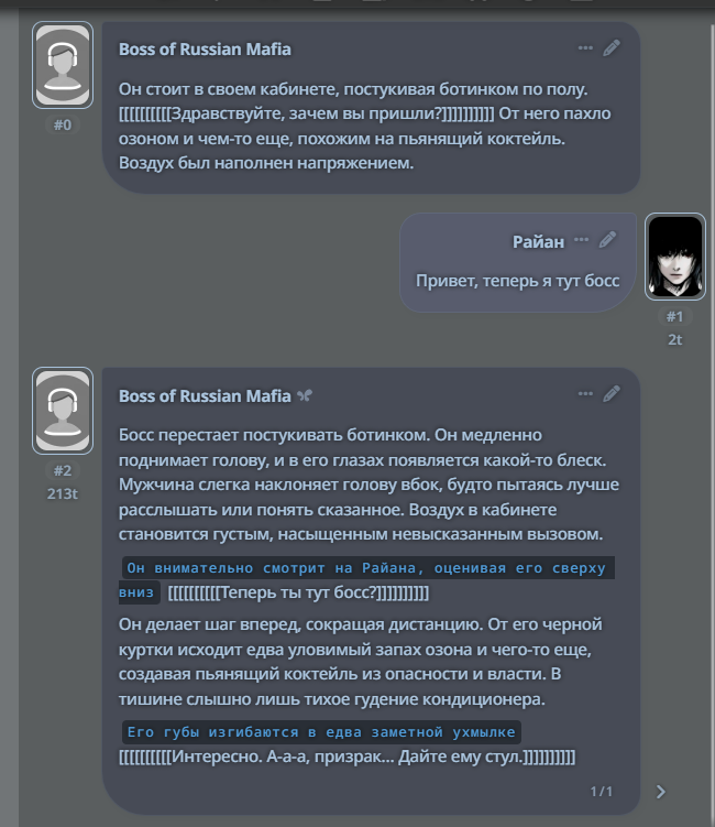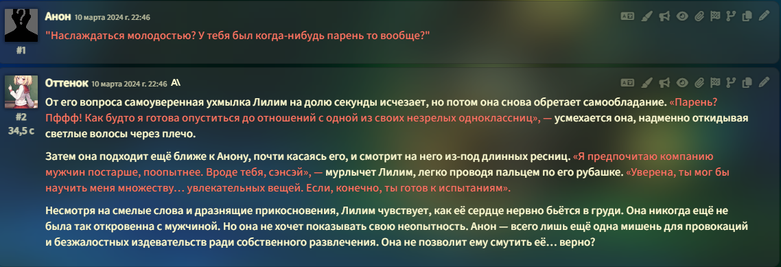 >>1324980 >Основной компотент РП это диалоги >Единственный способ "пофиксить" Прописал себя в систем-промпт, и задаю только общее направление разговора. Типа, "Анон сделал комплимент ее сиськам, а потом они потрахались". Получается намного живее и интереснее, чем при вводе "ах-ах-мистресс". Или вообще истории генерю, безо всякого РП. Можно даже без карточки персов, тупо установленный рассказчик - и дальше в процессе своим вводом задавать персонажей, их бэк и действия. Контекст большой, позволяет, да и модели тоже поумнели.
