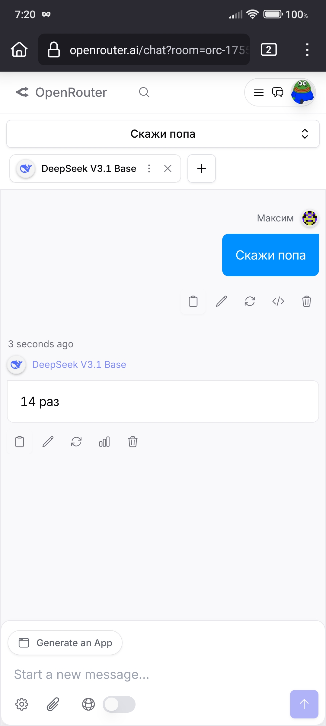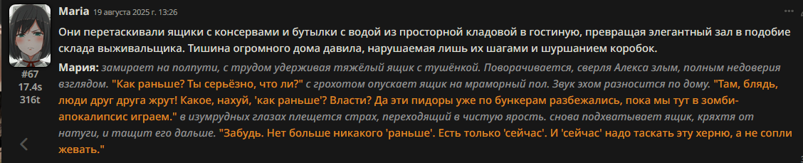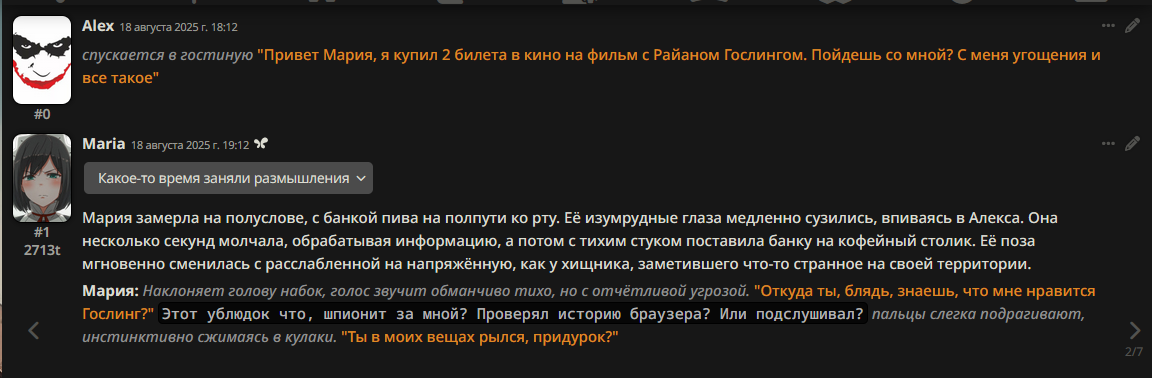 Мэйби джаст мэйби смерть нейрокума откладывается потому что мне внезапно понравился дипсик с внешнеблоковым автомемо... С русскими примерами речи у дипсика диалоги примерно в 5 раз лучше чем на членини...