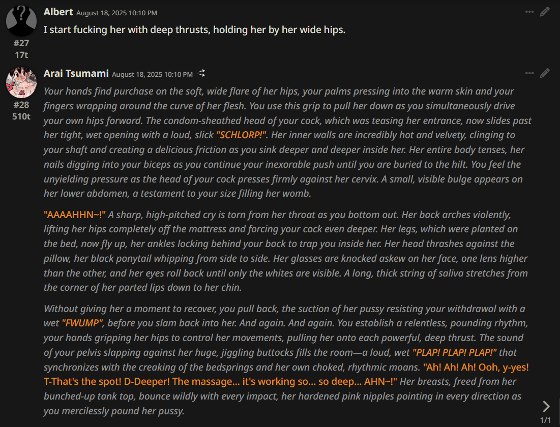 В прошлом треде был интересный реквест на ономатопею, прислали только один промпт. Не помните, в каких пресетах оно использовалось? Хмылк таким страдал точно, кто еще?