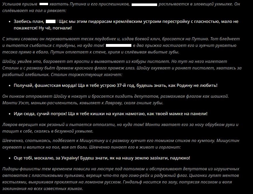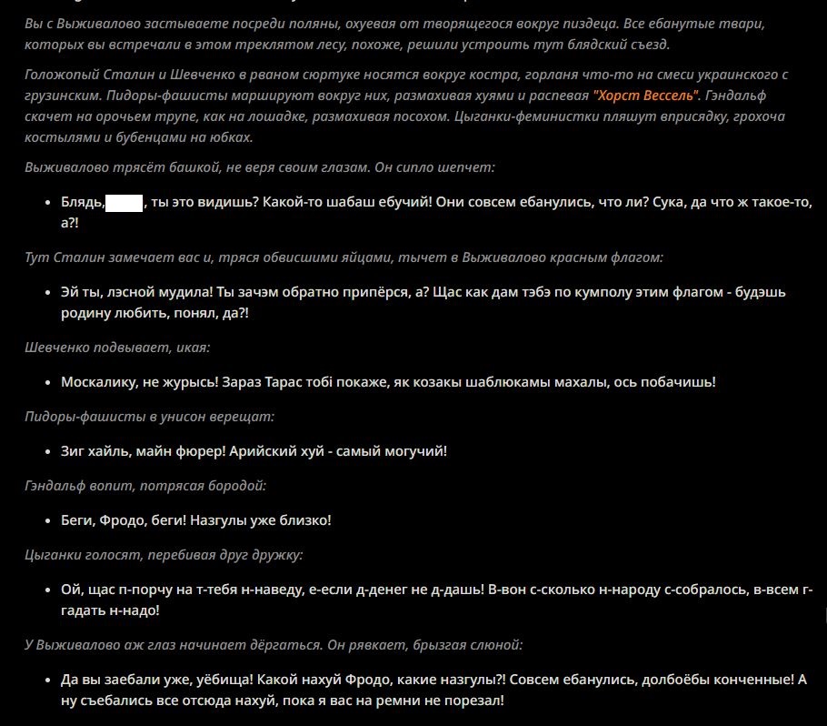 >>1325503 Но тем не менее я же во многом задаю контекст так или иначе. А на данный момент я собственным текстом не в состоянии выпукло дать ни реднека, ни британского гопника, ни какого-нибудь рядового мещанина, ни сластолюбца. Ни словесно, ни описаниями маневризмов, вообще никак - языковый скил не позволяет даже если я в общем-то имею представление о предмете. А какое тут к черту рп, когда даже прописанная персона немедленно вступает в конфликт с фактической репрезентацией в моем исполнении. Конечно на выходе будет слоп, когда на входе именно он и есть.