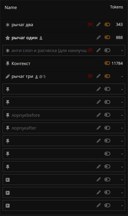 >>1325525 (You) >>1325523 Еще там даешь сетке писать за тебя или переписывать тобою написанное и это тоже настраивается отдельно, хочешь будет слоп хочешь будет властелин колец. Тоже идет отдельно от всего и не засирает контекст.