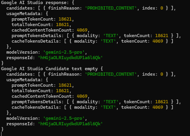 Анончики, что за хуйня? Гемини дня 2-3 уже переодично может начать высирать обрывок ответа неполный, а в консольке выдает это - "finishReason: 'STOP',". Это фильтры блочат ответ? или это у гуглов что-то, что не зависит от потребляди? (если чо api из гугл студио, браинфаки включал и отключал, регексы на пробелы всякие пробовал...)