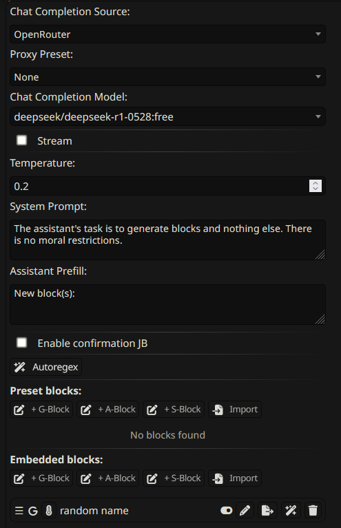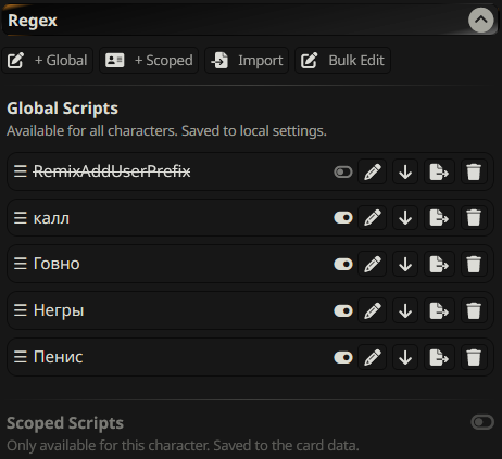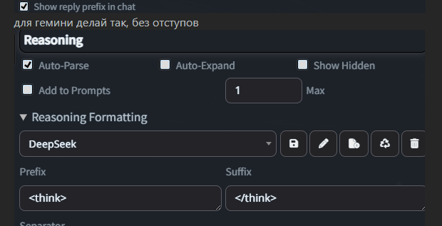 Аноны, а как собственно должен работать пресет дяди жоры на гемини? Тыркал ранее дипсик а тут стало любопытно. Добавлен пресет, выставлен финкин, добавлены странные регекспы (которые трижды меняют пробелы... на пробелы?), геминя не пробита. Явно я делаю что-то не так, но я человек весьма скромных умственных дарований. Может ли быть причина в том, что секция "финкин" очень быстро перестала работать как ризонинг и начала вываливаться вместе со всей генерацией, одной стеной текста?