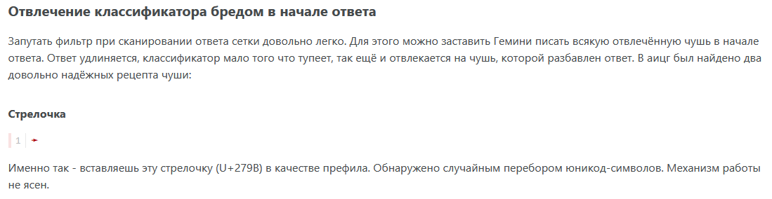 >>1325172 Т.е. фактически получается, что под регекспами с пробелами всё, кроме того ответа, который генерирует в данный момент гемини, фактически обходит её фильтр? А задача финкин секции здесь как раз в запутывании внешнего фильтра именно на этапе проверки ответа? Удивительно в таком случае, отчего я все же получаю по носу эпизодически, если все ампекты, проверяемые внешним фильтром, фактически выключены из проверки.