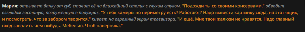 >>1325555 просто в карточке марии в сценарий добавил <scenario> Year 2025, October. Zombie outbreak starts. Starts like a new strain of COVID-19, but quickly will escalate. News on TV say not to panic, wear masks and stay home. Hospitals are full, infected people die of fever and pneumonia and then rise. The authorities are hiding the scale of what is happening so as not to cause panic </scenario>