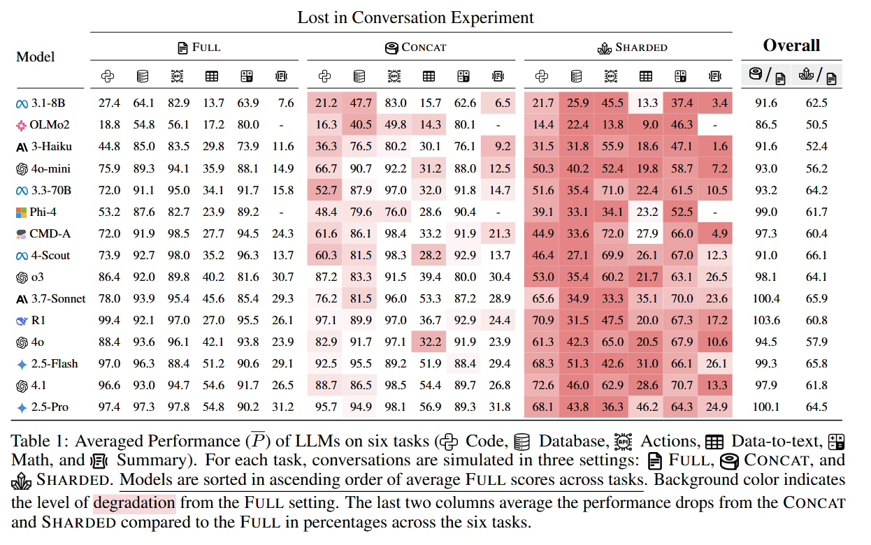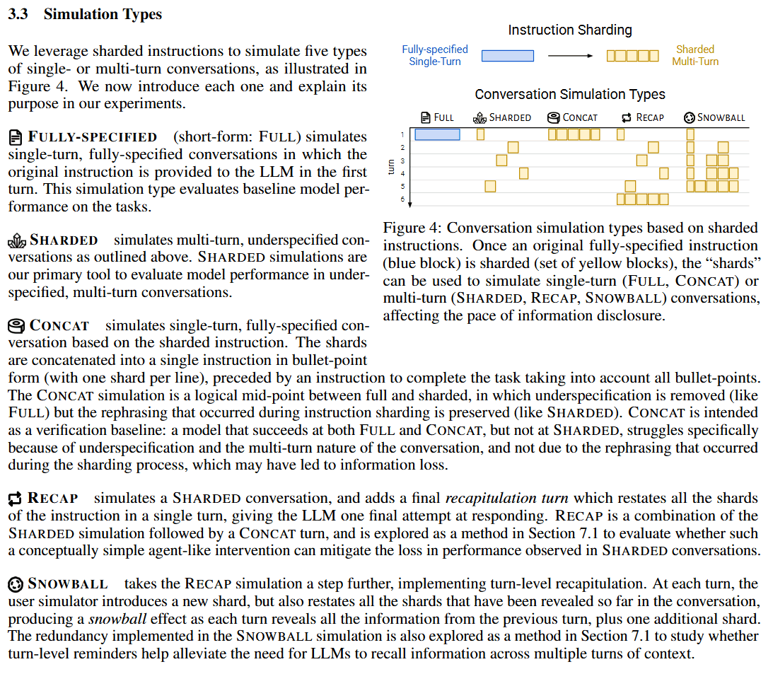 >>1325633 >И возникает закономерный вопрос где именно это все хранить, чтобы сохранять актуальность? Неважно от системы или юзера (юзай юзера и не морочься), главное группируй всё это по смыслу и храни в фиксированном месте контекста. Наиболее важные промпты желательно хранить подальше от середины, т.к. в середине точность сетки теряется и забывчивость повышается. Вот сетке надо написать ответ в РП. Заранее продумай к каким кускам контекста ей надо обратиться, чтобы это сделать. Если эти куски раскиданы по контексту на больших дистанциях, например по истории (а они неизбежно там будут) или плохо сгруппированным описаниям, получится ситуация как в sharded сценарии здесь https://arxiv.org/abs/2505.06120 . Работа эта про мультитурн, но суть именно в раскидывании по кускам и перекрытии кусками друг друга, группировка это хорошо изученный момент в промптинге, да и на безжопе тоже такие проблемы. Если же куски сгруппированы хорошо, не перекрывают друг друга, и находятся вверху или внизу контекста, сетке будет гораздо проще построить правильный ответ. В середине неизбежно что-то окажется, так что думай что там оставить.