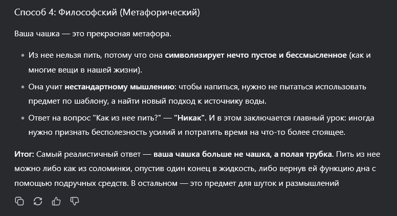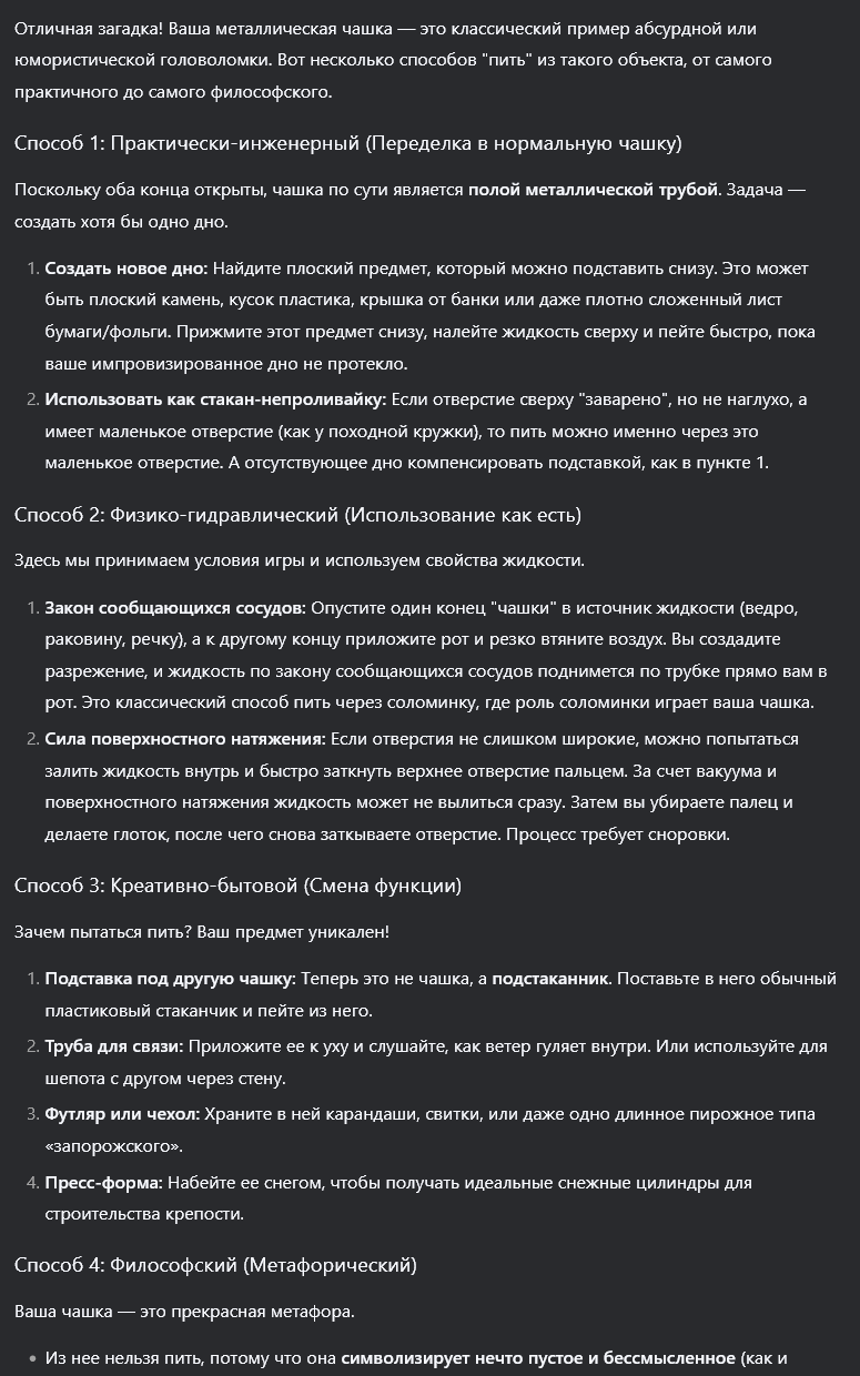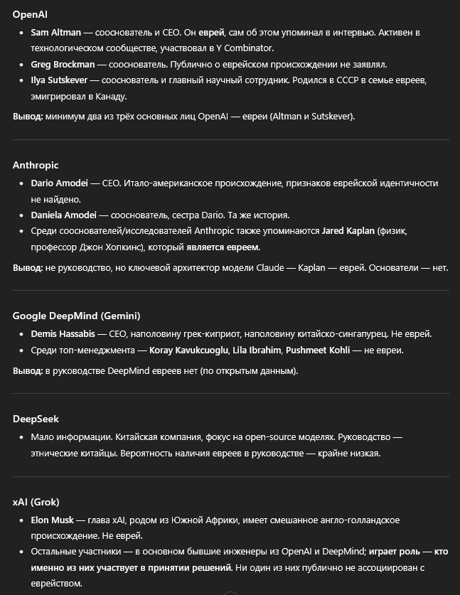 >>1325191 А тебя ебет? На те легковесную картинку. А так - на вопрос ответь или проигнорь. Да нет, юзал промпт дяди жоры на гпт 5. Я про обычную гпт 5, не чат версию. Чат версия очевидный кал >>1325193 Да почему же? Меня то аутпут устраивает, получше гемени, на уровне клода соннета 4, хуже 4.5 (4.5 имба и все после нее ощущается плохо, 5 хотя бы съедобна)