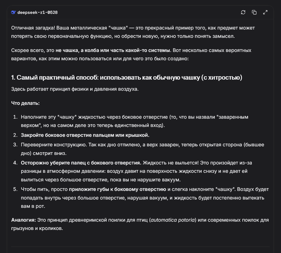 >>1325662 >Дипсик не понимает систем Январский R1 не понимает, т.к. они в чём-то наебались при тренировке. В 0528 он функционирует как юзер промпт нормально. >>1325649 Лучше бы ты пруфанул что систем чем-то принципиально отличается от юзера кроме того что пишут авторы модели. Да и даже то что авторы пишут. Потому что с клодом мы тут тестили пиздец сколько, эффект был на уровне плацебо можно сказать.