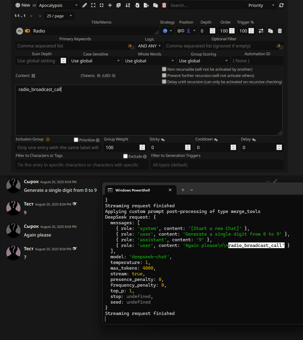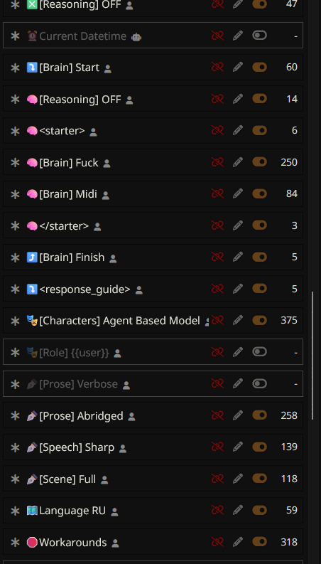 Соответственно мои допущения на этот счёт: 1. Я умудрился задать неработоспособную позицию/глубину/роль/ещё что-то и надо было всего лишь... 2. Мне нужен был какой-то спец режим Prompt post-processing-а 3. Каким-то образом выбранный синтаксис как-то по особому интерпретируется таверной