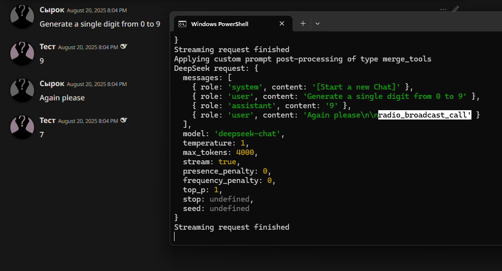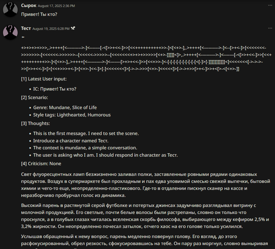 >>1324666 (OP) Доработал антиэхо костыль, первые 3 лога с ним, вторые 3 без него, результат думаю понятен. Возможно можно сделать еще лучше. Тестировуйте. Кому не нравятся мысли можно их вырезать регексом в принципе, решил полностью не убирать мало ли кому-то нужны. https://files.catbox.moe/hd0ez3.zip