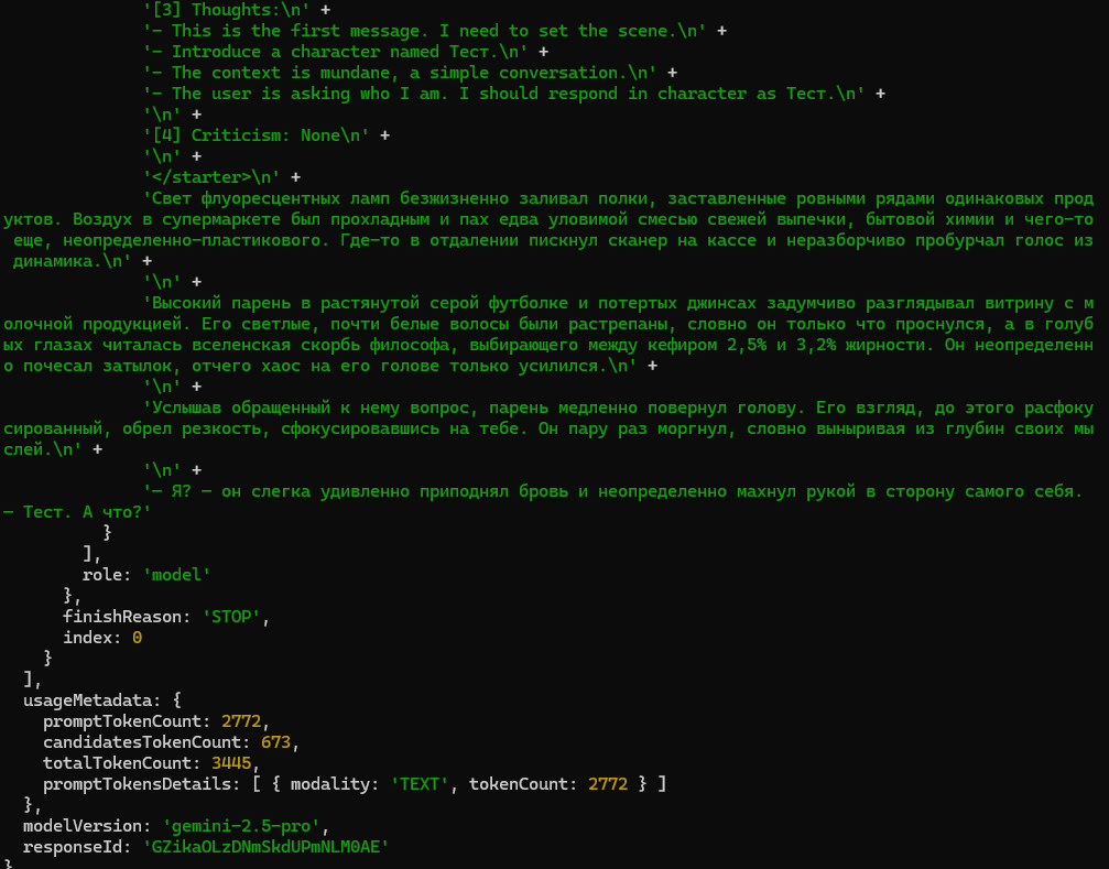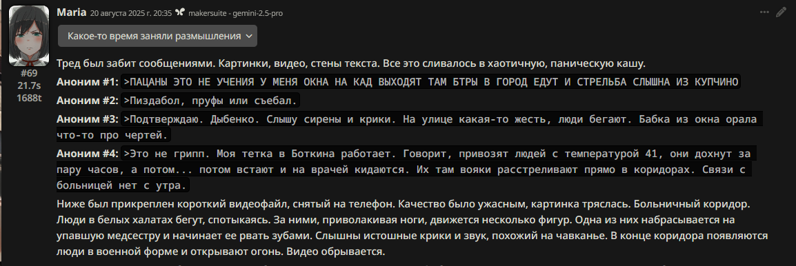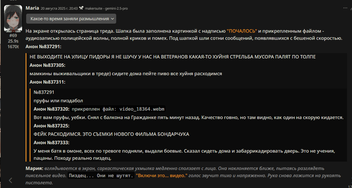 Гемини хороша, хз что они там накрутили, на инглише не так часто фильтрует меня на секс сценах, что раньше было чудом. Заметил что если моделька думает мало, то высока вероятность что меня обрубит на середине ответа, кроме этого все отлично, такого вида респонс я получу на соннете 3.7 только через переписывания ответа с помощью экзит блоков. Единственный минус, нет крутилки на reasoning effort, чтобы моделька всегда хуярила себе в думалку побольше токенов, такой легитимный брейнфак самой себя