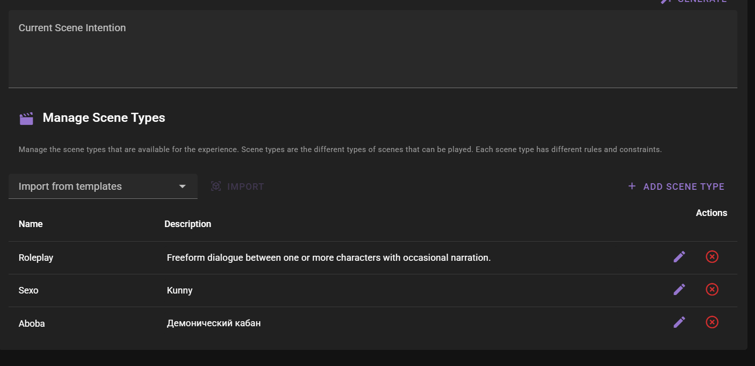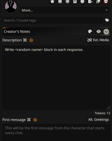 >>1324666 (OP) Нубский вопрос, я недавно вкатился в чатботы. А под что, под какое использование пишутся эти тонны карточек персонажей с чуба с этими вот: >{{char}} is not a single character, but a roleplay setting, including bunch of different characters. {{char}} never speaks itself, it only impersonates other characters appearing in this scenario. Явно же не для использования таверны с пресетами?