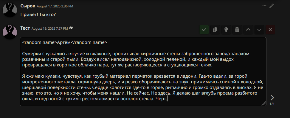 Агентный луп с полноценным тул юзом тебе нахуй не нужен, как и лапша из нод, потому что каждый новый вызов добавляет проблем. Тебе нужен один, максимум два (с разным назначением) вызова маленькой допсетки без тул юза, ибо сетка ещё и начинает путаться в тулзах, мы по той же причине инфоблоки разгружаем на допсетку между прочим, а ты хочешь наоборот нагрузить. Переписыватель и техническая сводка вроде инфоблока, не связанные в цепочку, это максимум. И никогда результат с этим не будет как анон пишет: >индивидуально настраиваешь диалоги чтобы витиевались и постмодернично синонимировались при этом не засирая контекст и не превращая наррейшон и историю в в пурпурную прозу Это всё маняфантазии и он этого не делал, а если бы делал, то понял бы что это всё увеличивающийся пердолинг ради всё уменьшающегося результата, в конечном счёте никогда ты не поборешь большинство эффектов без переобучения сетки или внутриконтекстного обучения.