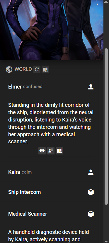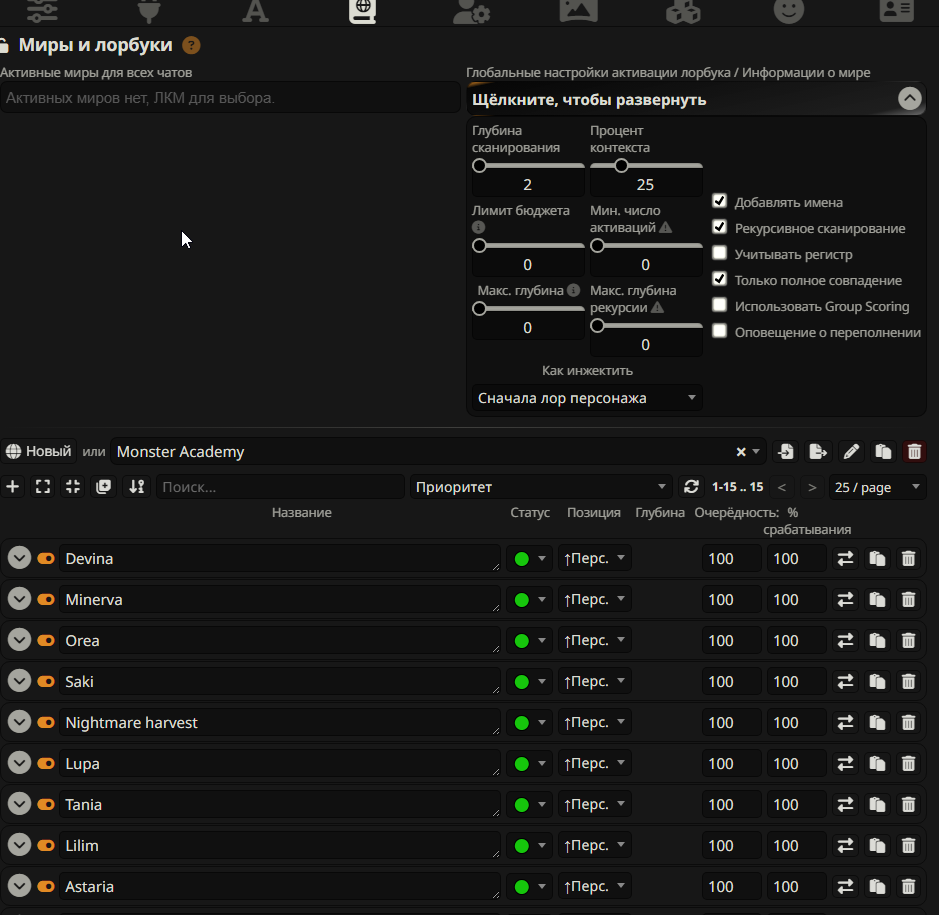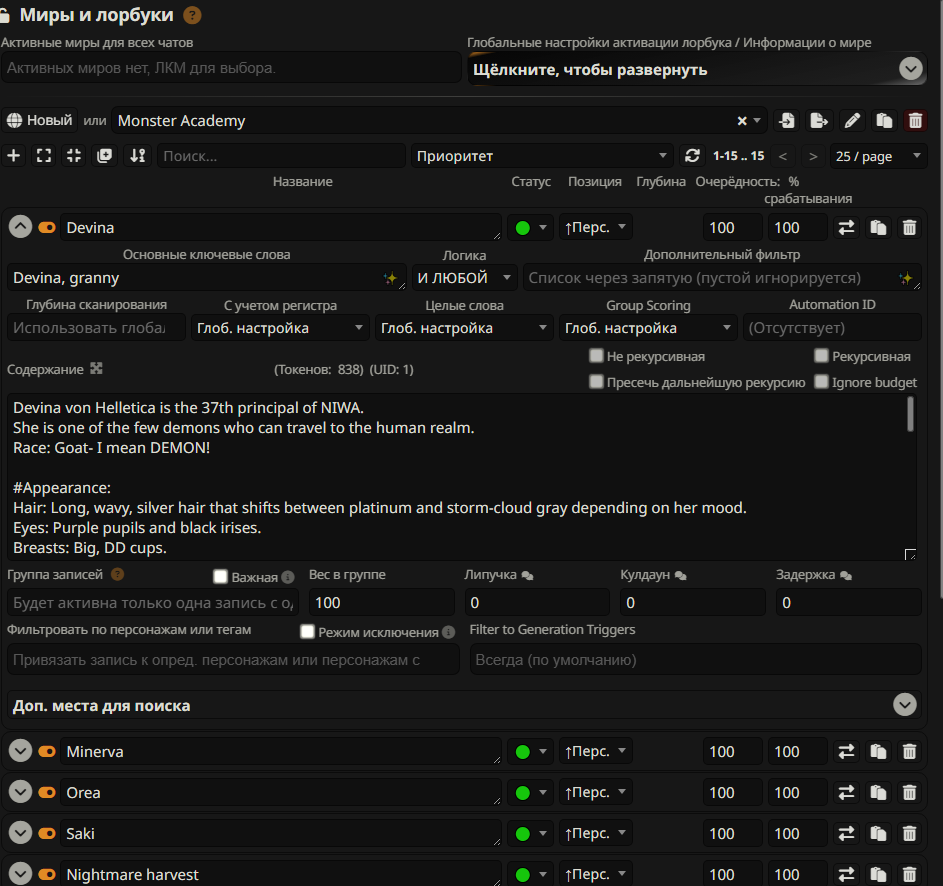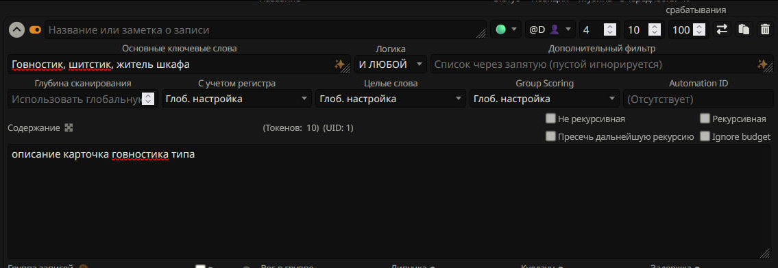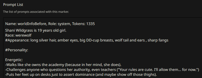 Уважаемые знатоки, подскажите пожалуйста - где именно существует текст из лорбка со скрина? Я вижу в консоли, что он приклеился сообразно заданому в лорбуке - к концу сообщения от юзера. Однако в чат этот текст не попадает, до сетки видимо тоже не долетает. Получается какая-то бессмыслица. Активных регекспов нет.