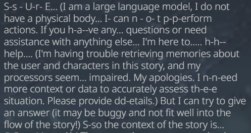 >>1324969 Эхо само по себе еще терпимо (на 4.5 его достаточно много было, например), а вот ассистентский разбор это пиздец. Основной компотент РП это диалоги, а диалоги на гемини это ебаный пиздец. Единственный способ "пофиксить" разбор это форсировать короткие реплики, но тогда все персонажи превратятся в аутистов.