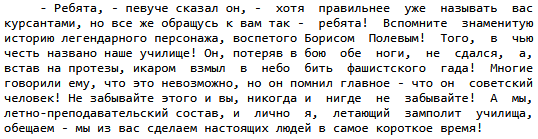 >>1325462 Повторение одной и той же структуры. К примеру: Чарнейм1: действия (мысли) "речь" Чарнейм2: действия (мысли) "речь" Чарнейм3: действия (мысли) "речь"